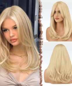 FESHFEN Blonde Wigs with Bangs – Long Layered Straight Light Blonde Natural Looking Synthetic Hair Wig for Women Daily Party Use, 18 inch