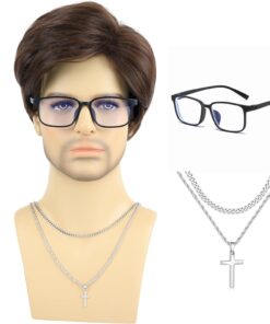 Men’s Short Wig with Blue Light Glasses & Cross Necklace – Realistic Synthetic Hair with Natural Look Hairstyle for Daily Wear, Cosplay & Costume (Brown)