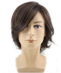BERON Men’s Brown Short Wig Medium Style Wavy Bouncy Side Swept Fringe Bang Hairstyle Wig Heat Resistant Synthetic Hair Wigs with Wig Cap Dark Brown