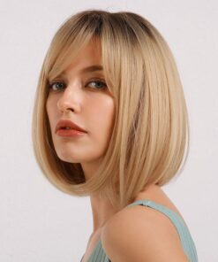 HAIRCUBE Blonde Bob Wig with Bangs Short Bob Wigs for Women Short Blonde Wig with Dark Roots Heat Resistant Synthetic Wig Natural Looking for Daily Use