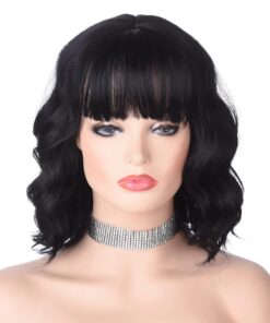Short Black Wavy Wig with Bangs for Women 12 Inch Natural Synthetic Hair Bob Wigs for Womens Daily Wear (Black)