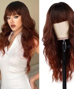 Auburn Wigs with Bangs for Women Long Curly Wavy Ombre Wigs Heat Resistant Synthetic Bangs Wig for Daily Party Use (Ombre Auburn, 26 Inches)