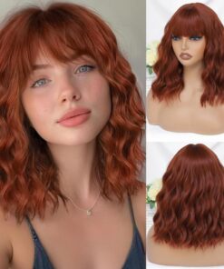 Auburn Wig with Bangs for Women 14 Inch Shoulder Length Short Bob Wavy Curly Auburn Wig Heat Resistant Synthetic Wigs