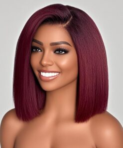 99J Burgundy Yaki Straight Bob Wig Human Hair Kinky Straight Lace Front Wigs Human Hair Pre Plucked with Baby Hair Pre Cut Lace Wig Short Wine Red Blunt Cut Bob Wigs 12 Inch
