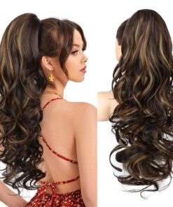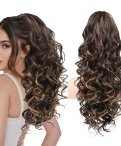 REECHO Ponytail Extension, 24″ Claw Clip in Long Curly Wavy Ponytail Hair Extension Jaw Clip on Pony Tails Hairpiece for Women – Dark Brown with Highlights