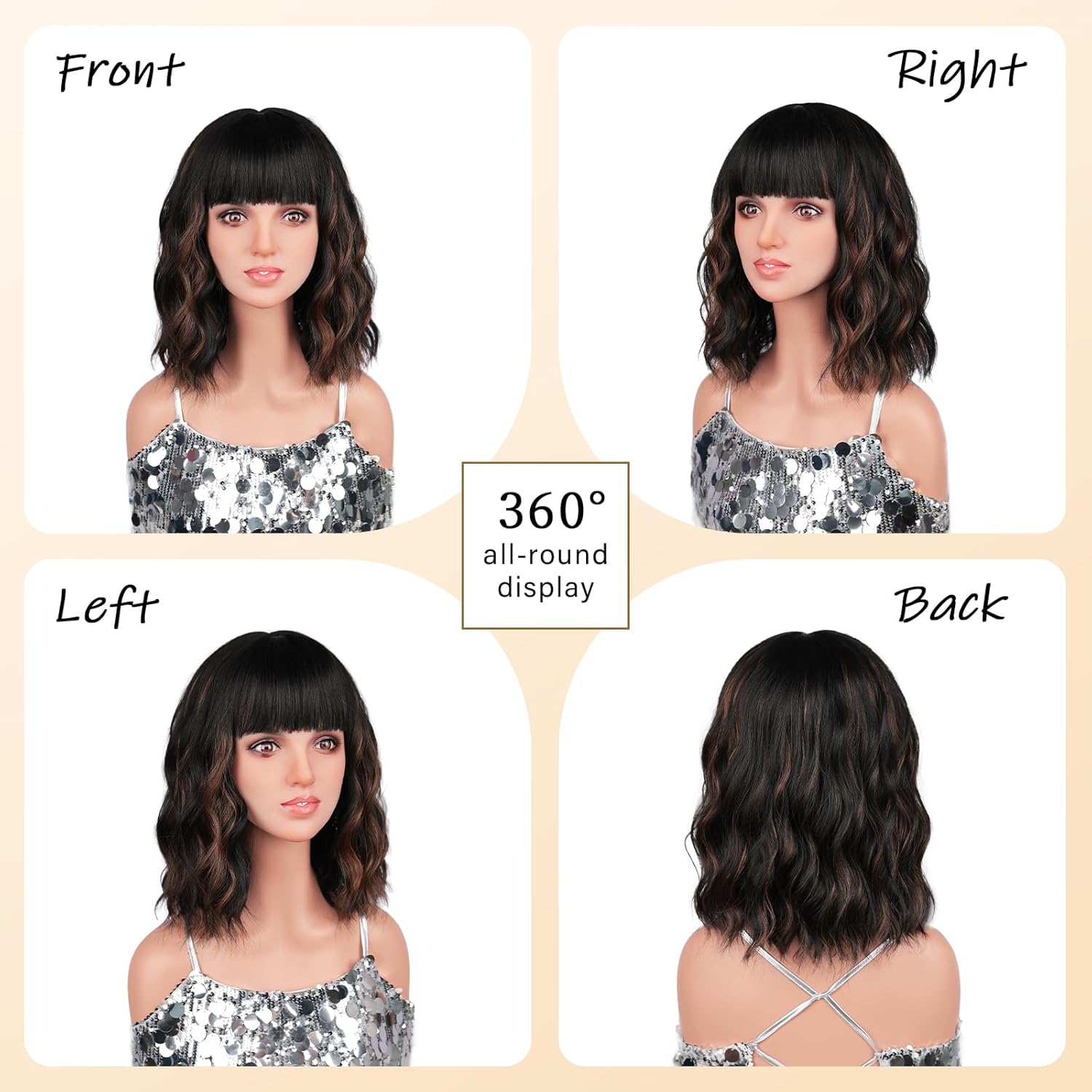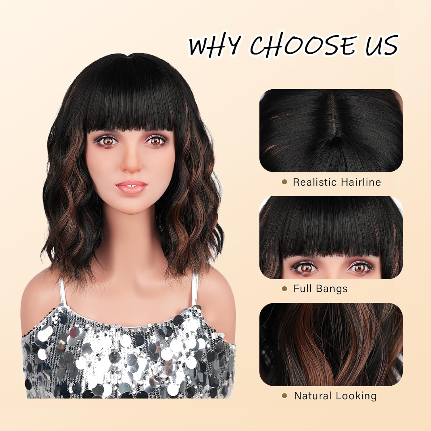 14 Inch Wavy Brown Mixed Black Wig with Bangs – The Perfect Accessory for Stylish Hair