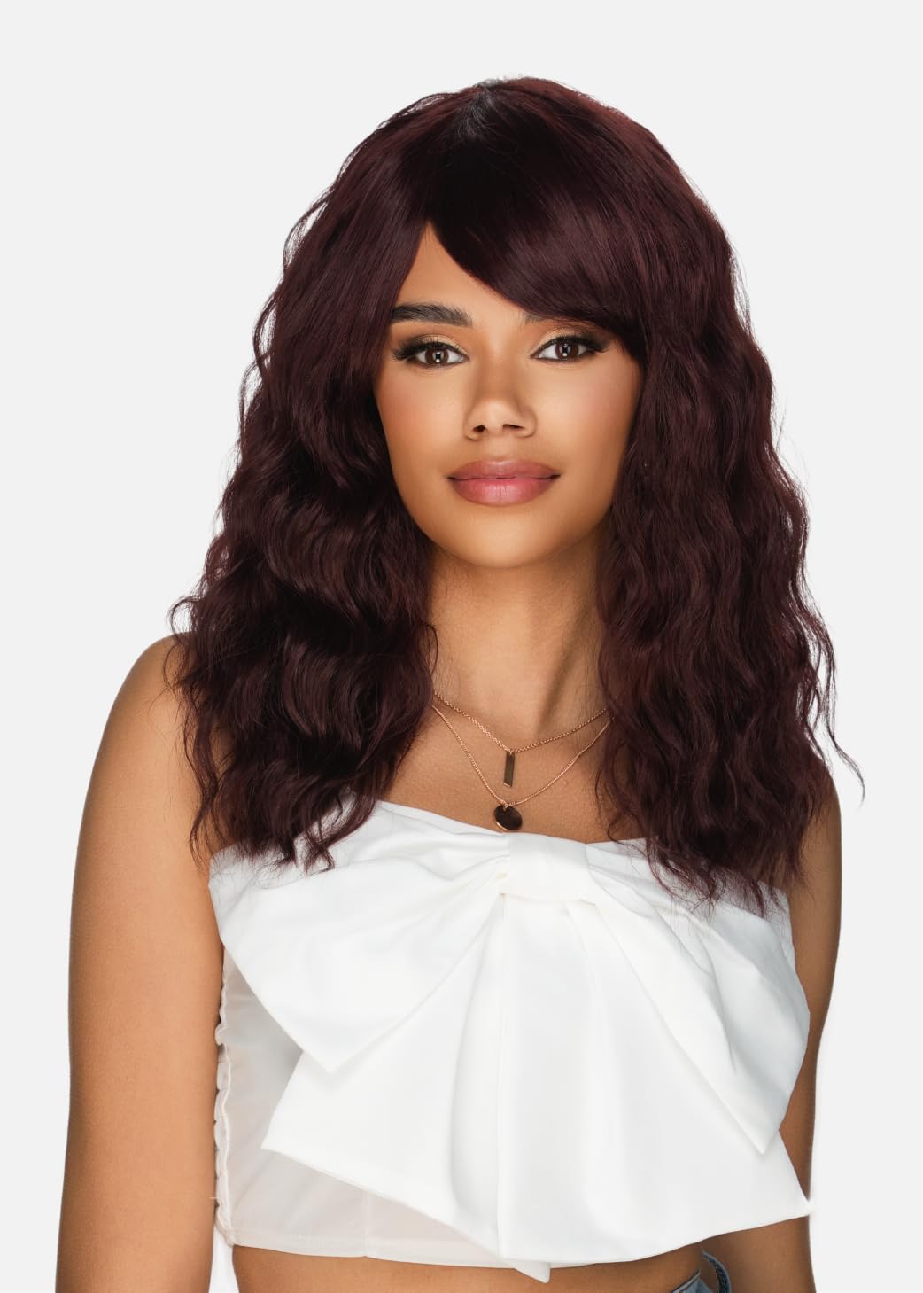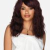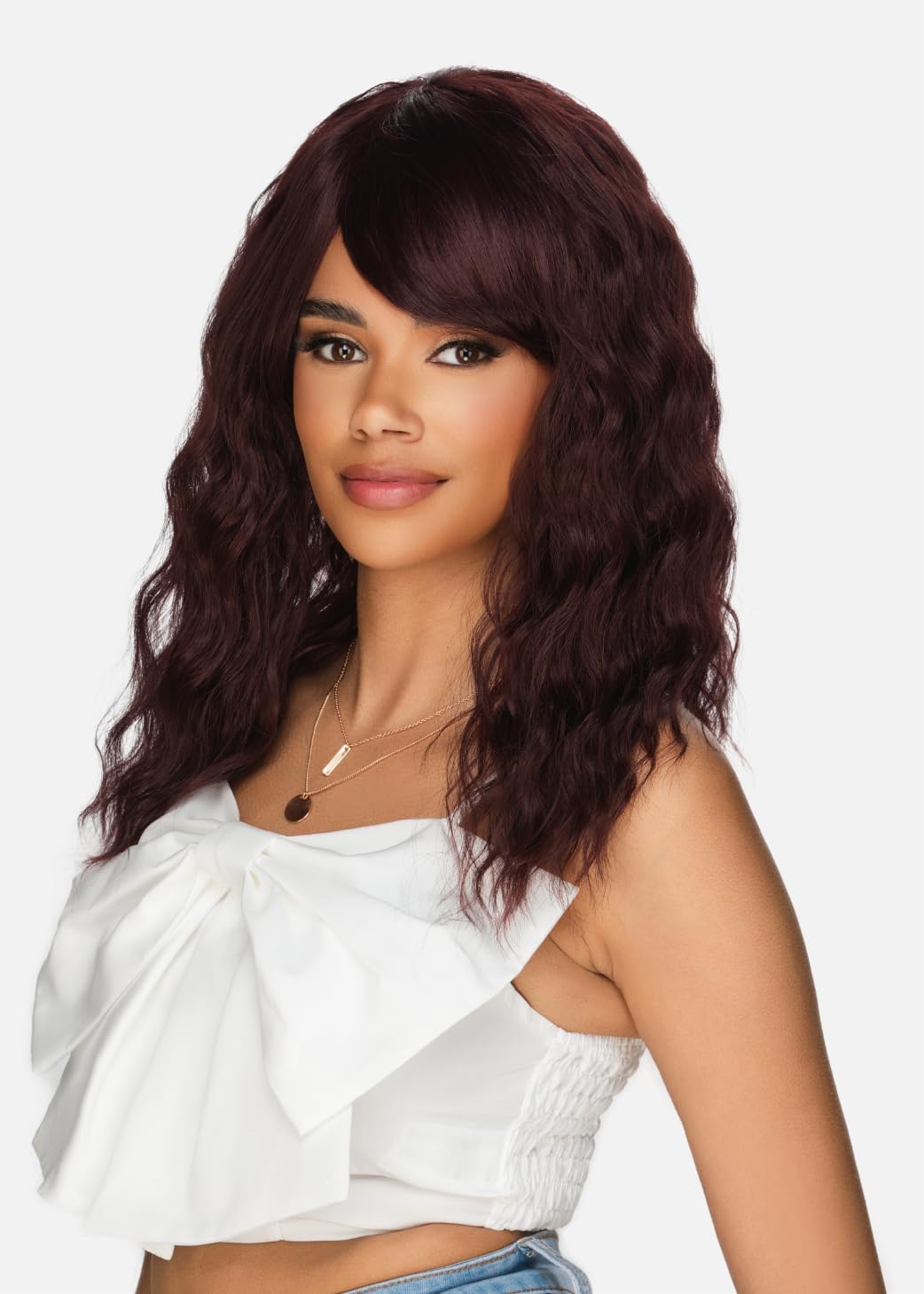 - It showcases a natural-looking texture with its soft waves and layered bangs.