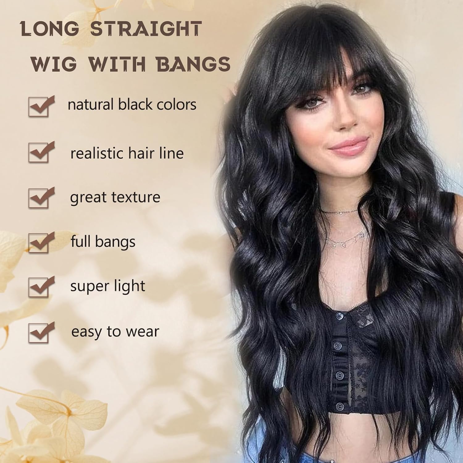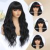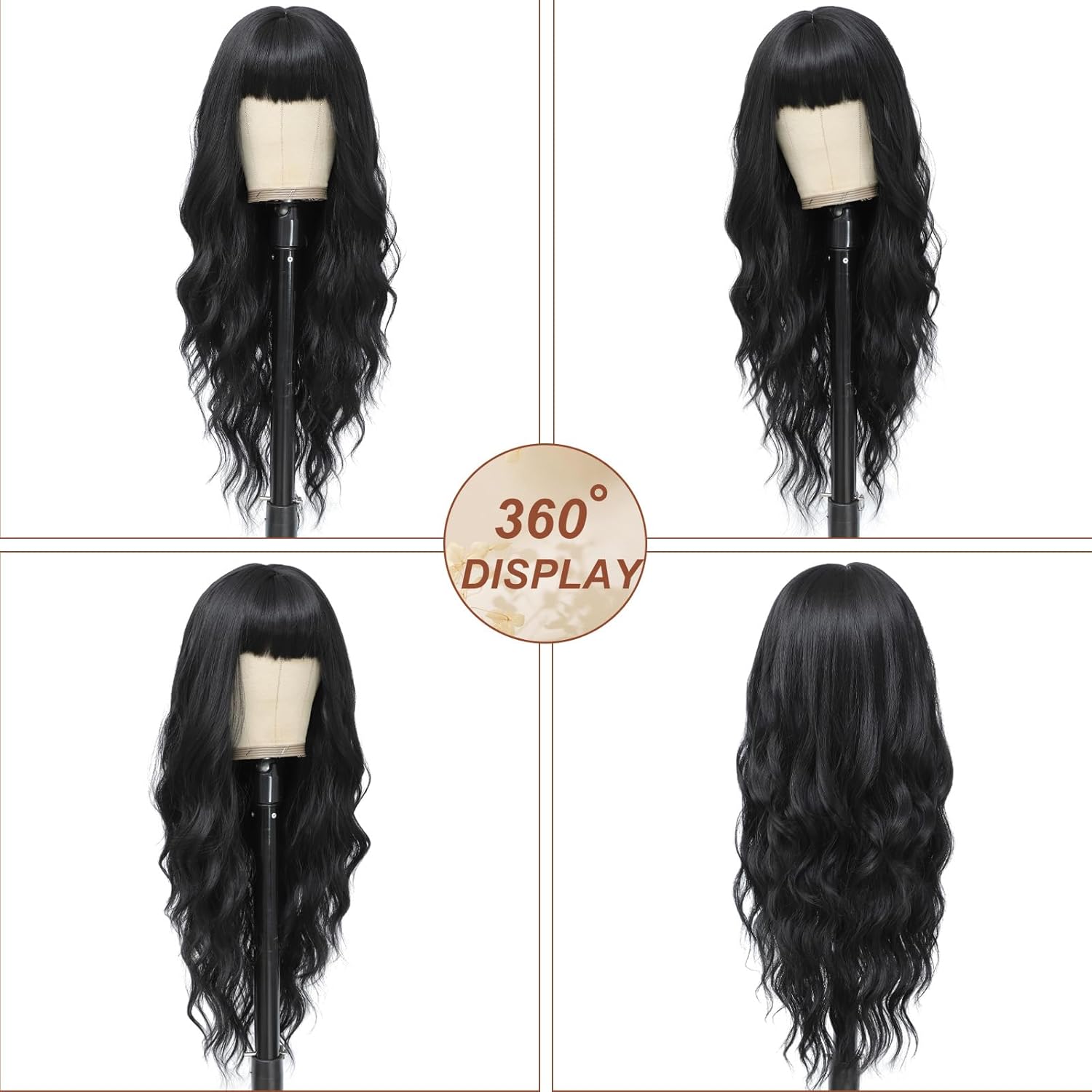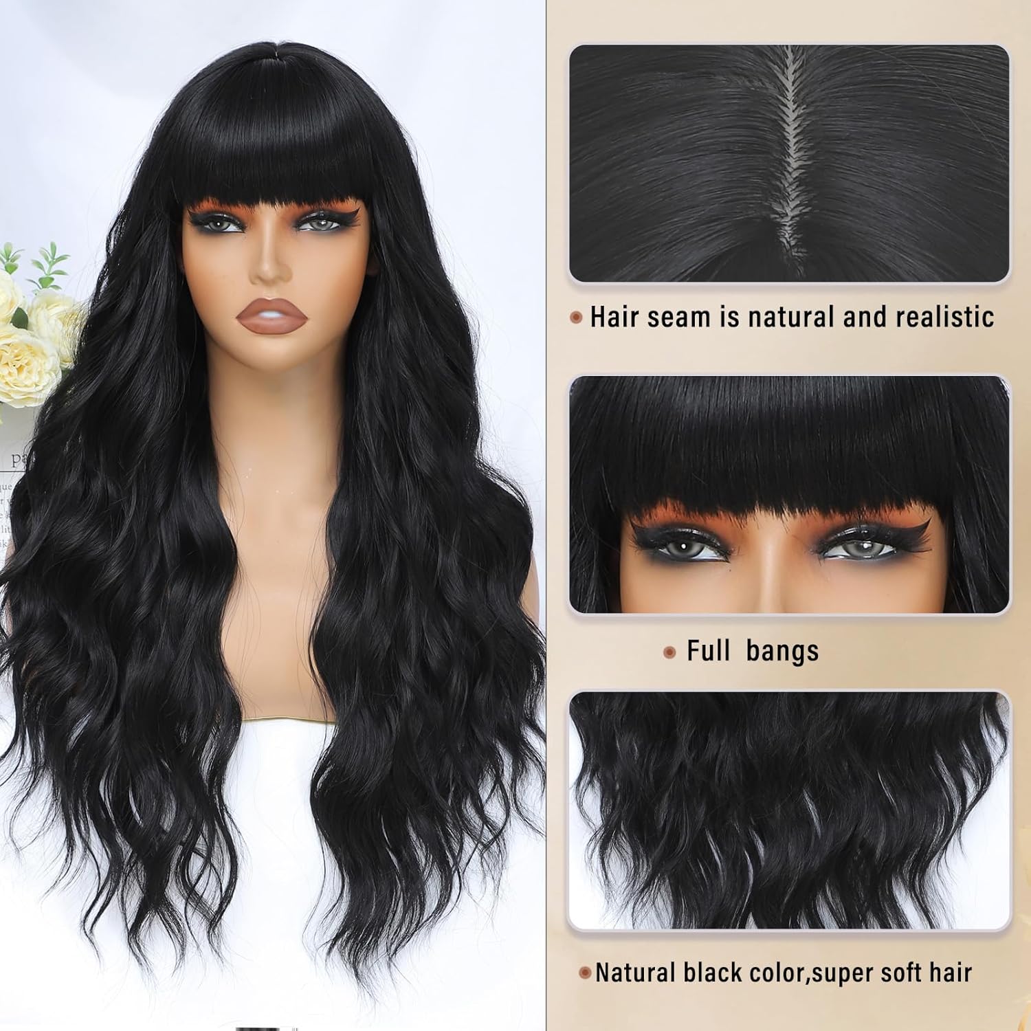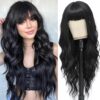 - Long Black Hair Wig: This wig is characterized by its natural black wavy hair, complete with full bangs that perfectly frame your face, adding a feminine touch to your look.