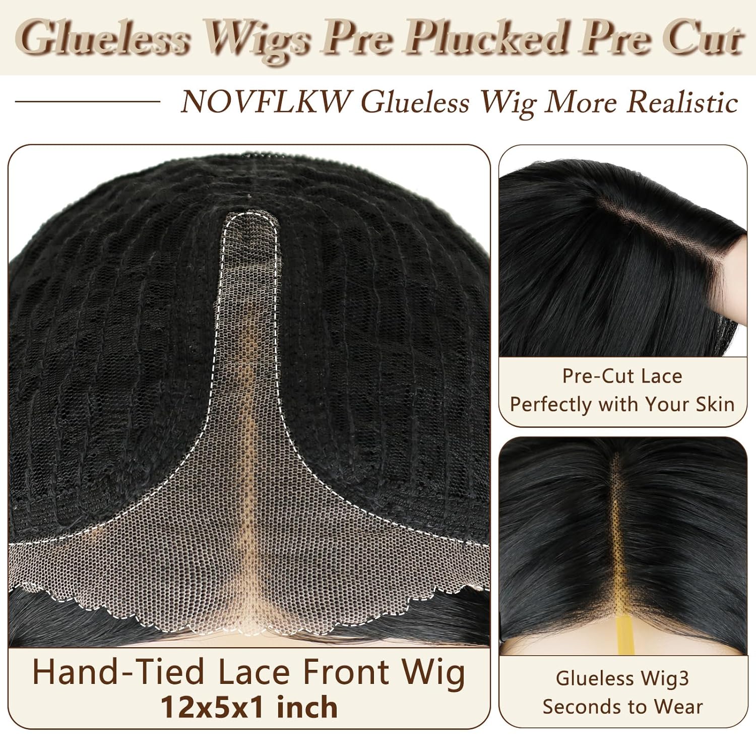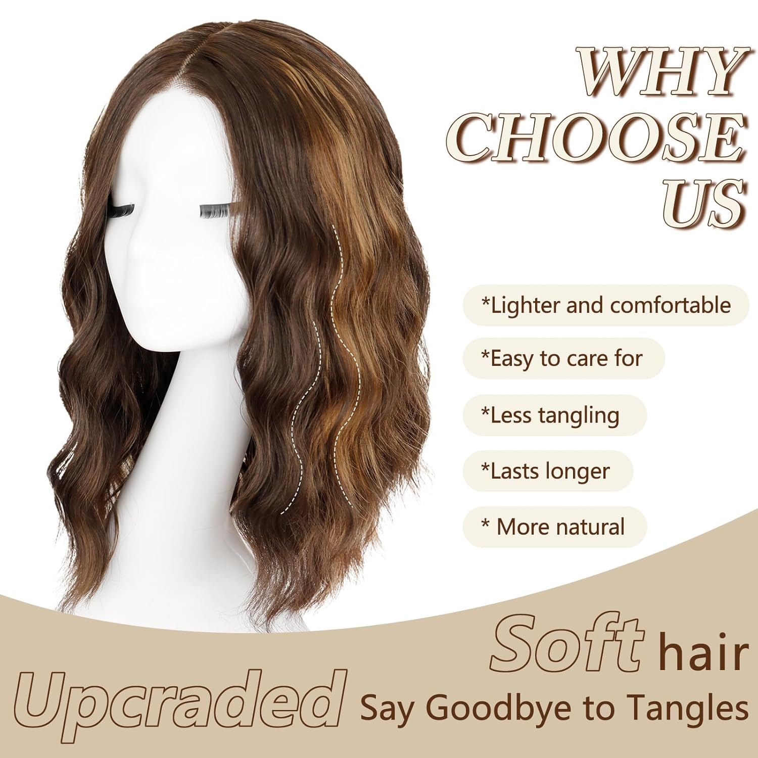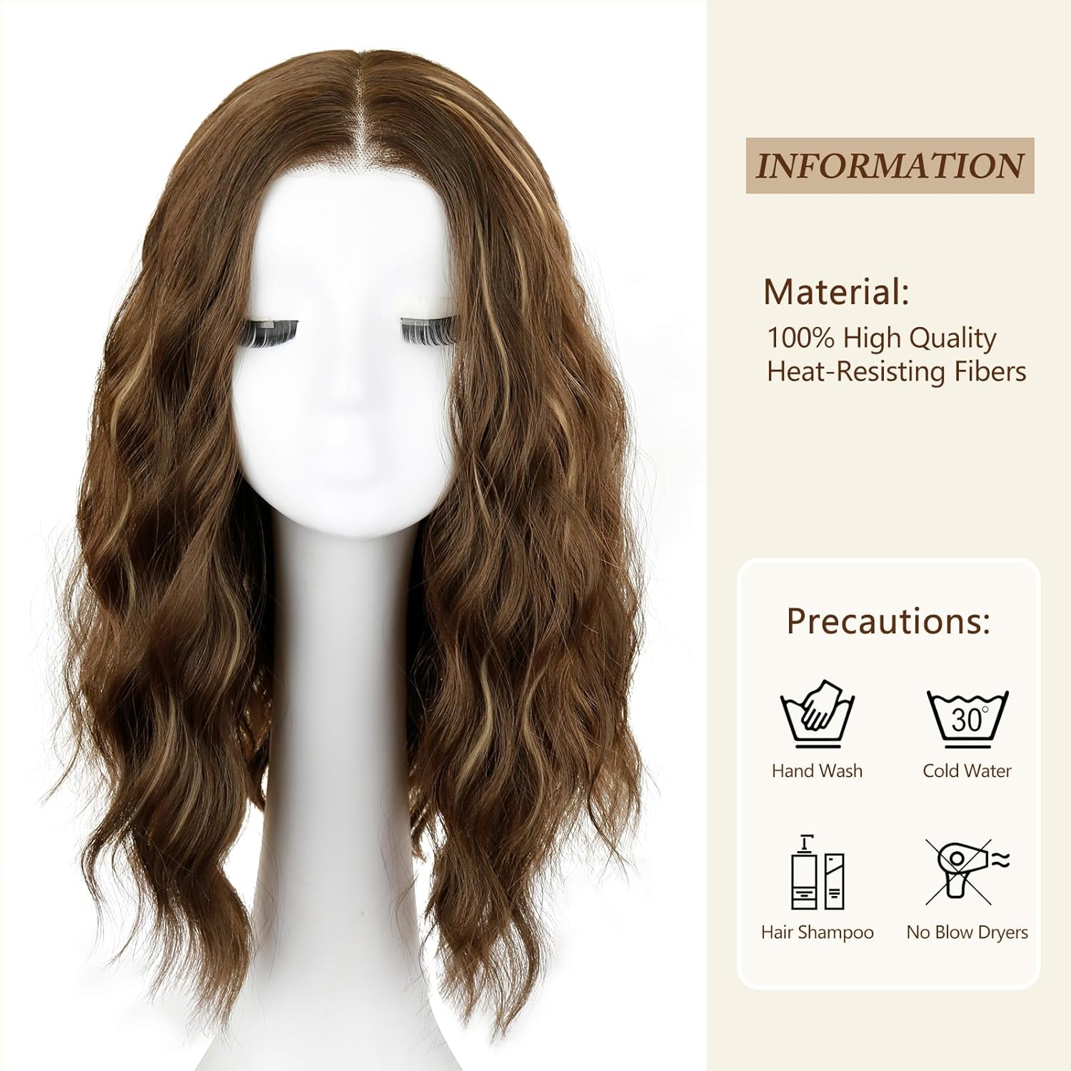Fraud Blocker Brown Highlight Short Wavy Wig for Women Shoulder Length Middle Part with Pre Cut Lace Hairline Wavy Wig Natural Appearance Synthetic Heat Resistant Fiber for Everyday Hairstyle 16 Inch | Wigsretail44.com