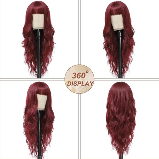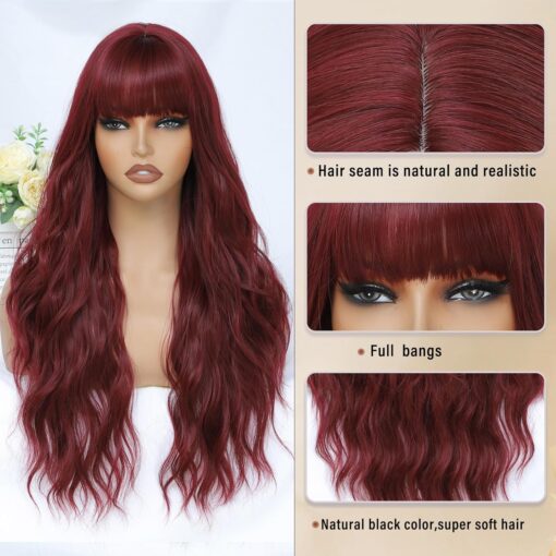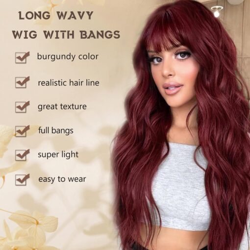 Achieve a stunning and feminine look with the Burgundy Wavy Wig for Women from MINSEEYOO. This long wig with bangs is perfect for adding a touch of glamour to your everyday style or for special occasions like Halloween, weddings, and parties. Made with premium heat-resistant synthetic fiber, this wig offers a natural look and comfortable fit.