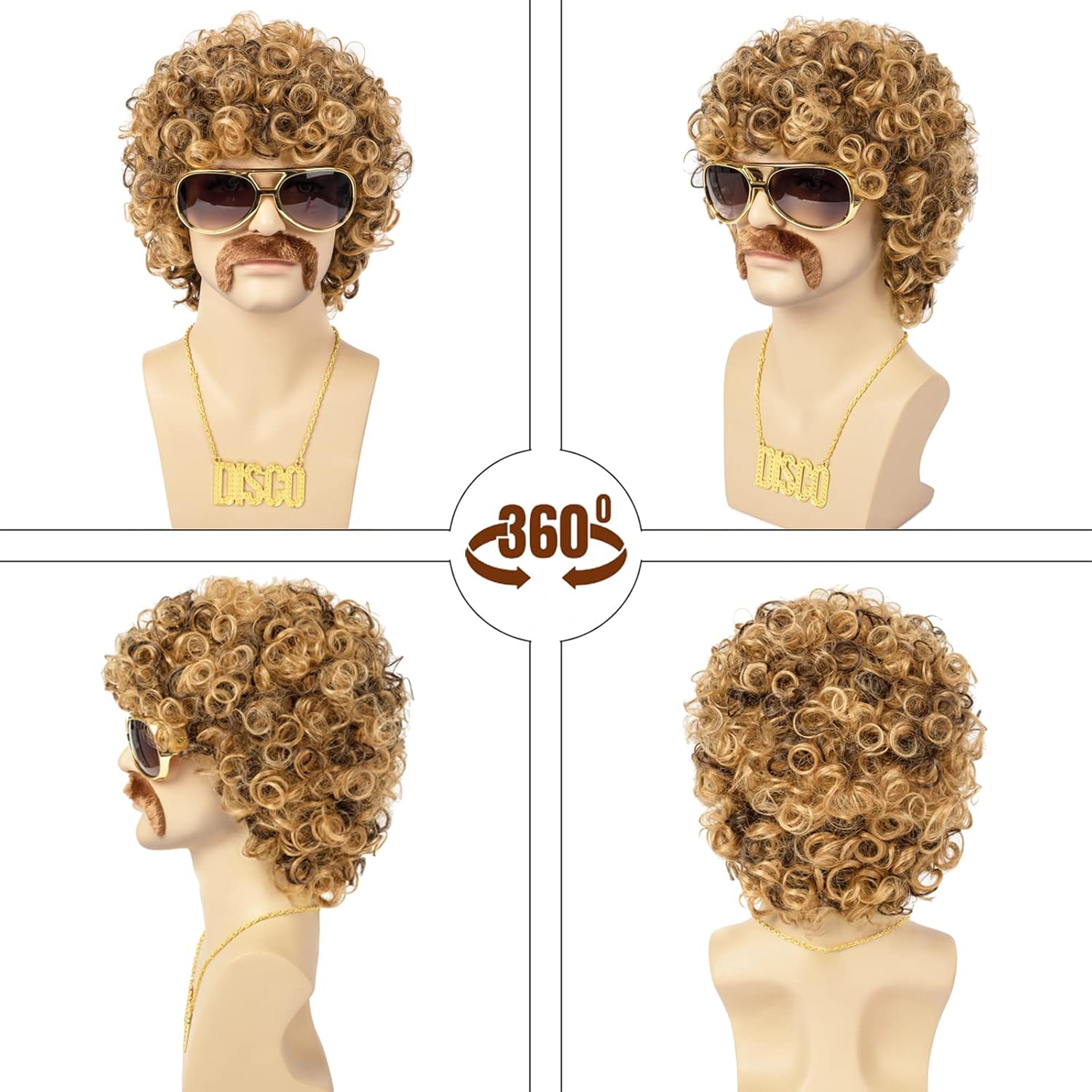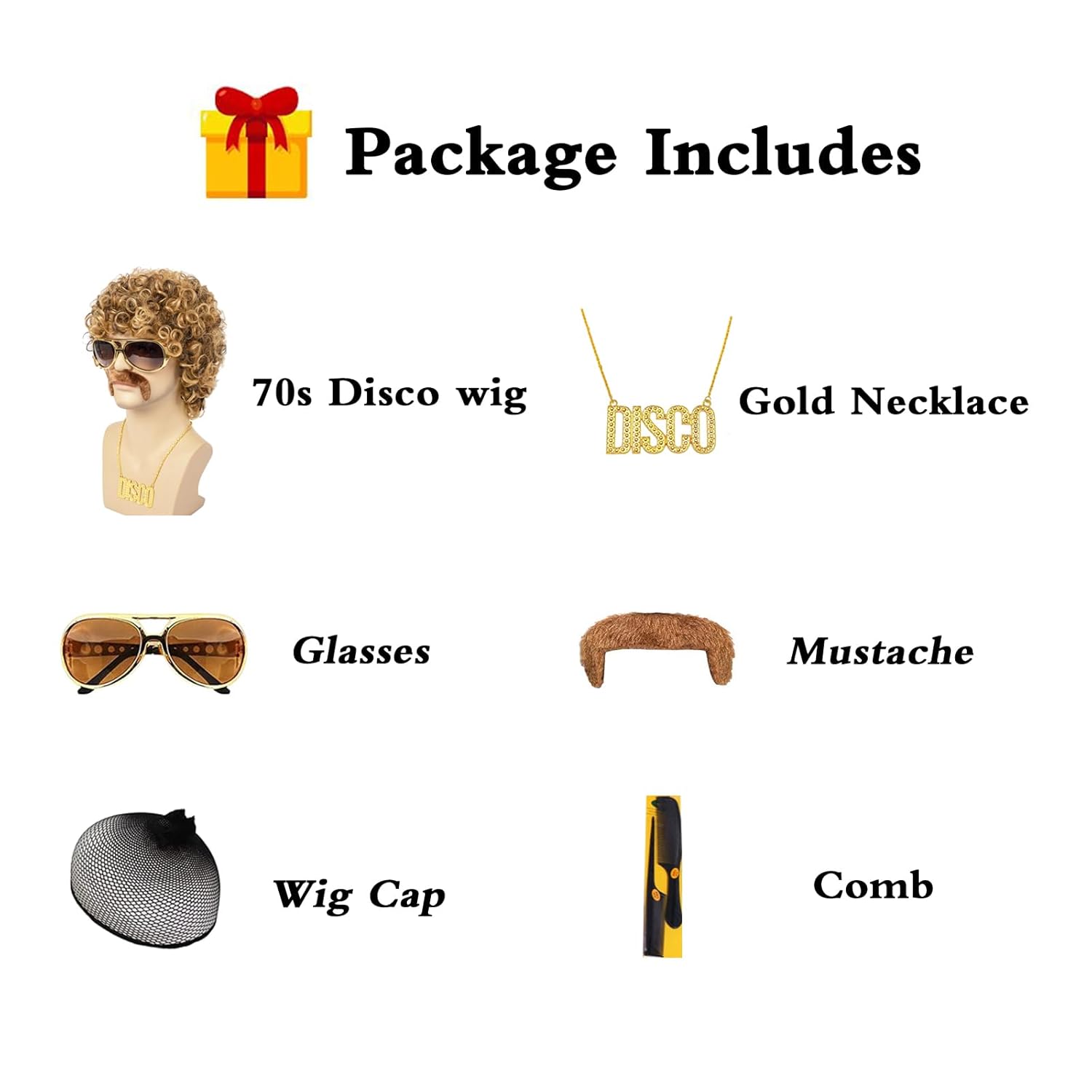 - Package Includes: Wig, gold necklace, mustache, glasses, combs, and wig cap