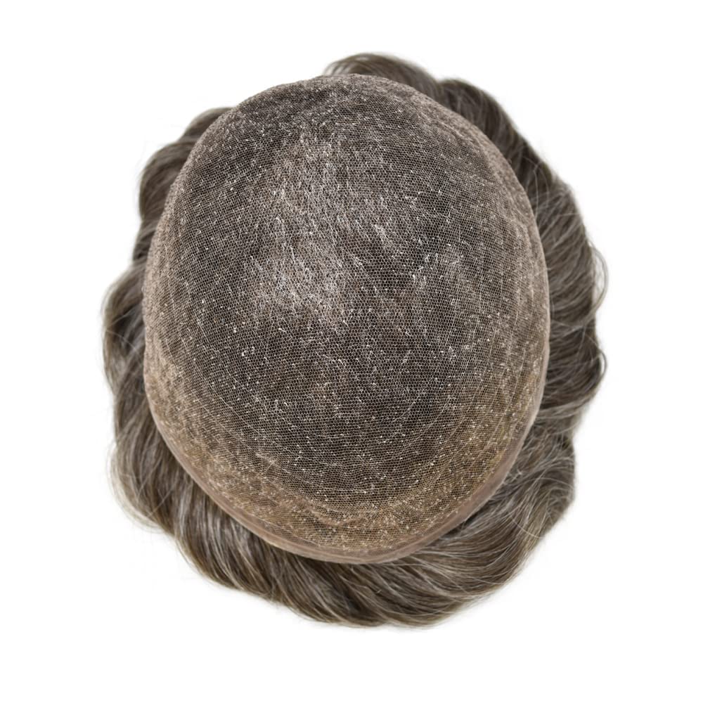 Full Swiss Lace Toupee For Men Hair Piece Real Human Hair Replacement System Mens Toupee Hair System For Men Bleached Knot 8×10 100% light to medium density#320 3# DARK BROWN+20% GREY