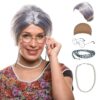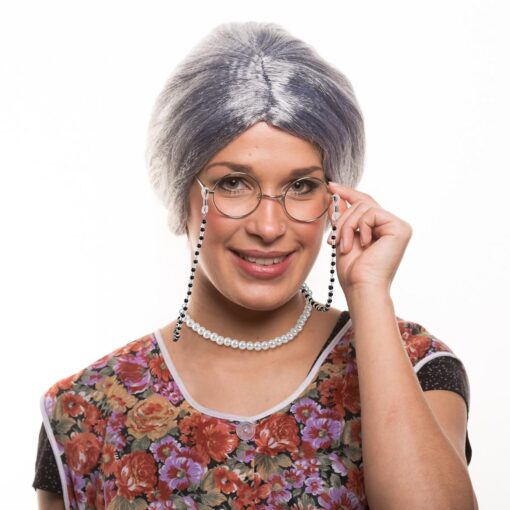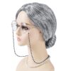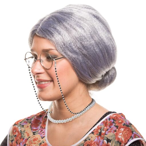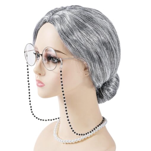 - Includes a gray bun grandma wig, 2 wig caps, pearl necklace, glasses, and glasses chain