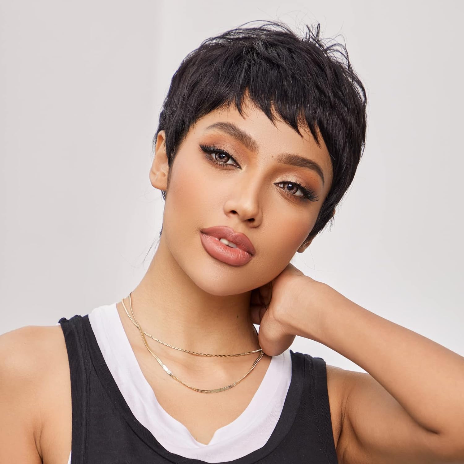 – Hair Style: Short, fluffy pixie cut with layered textures