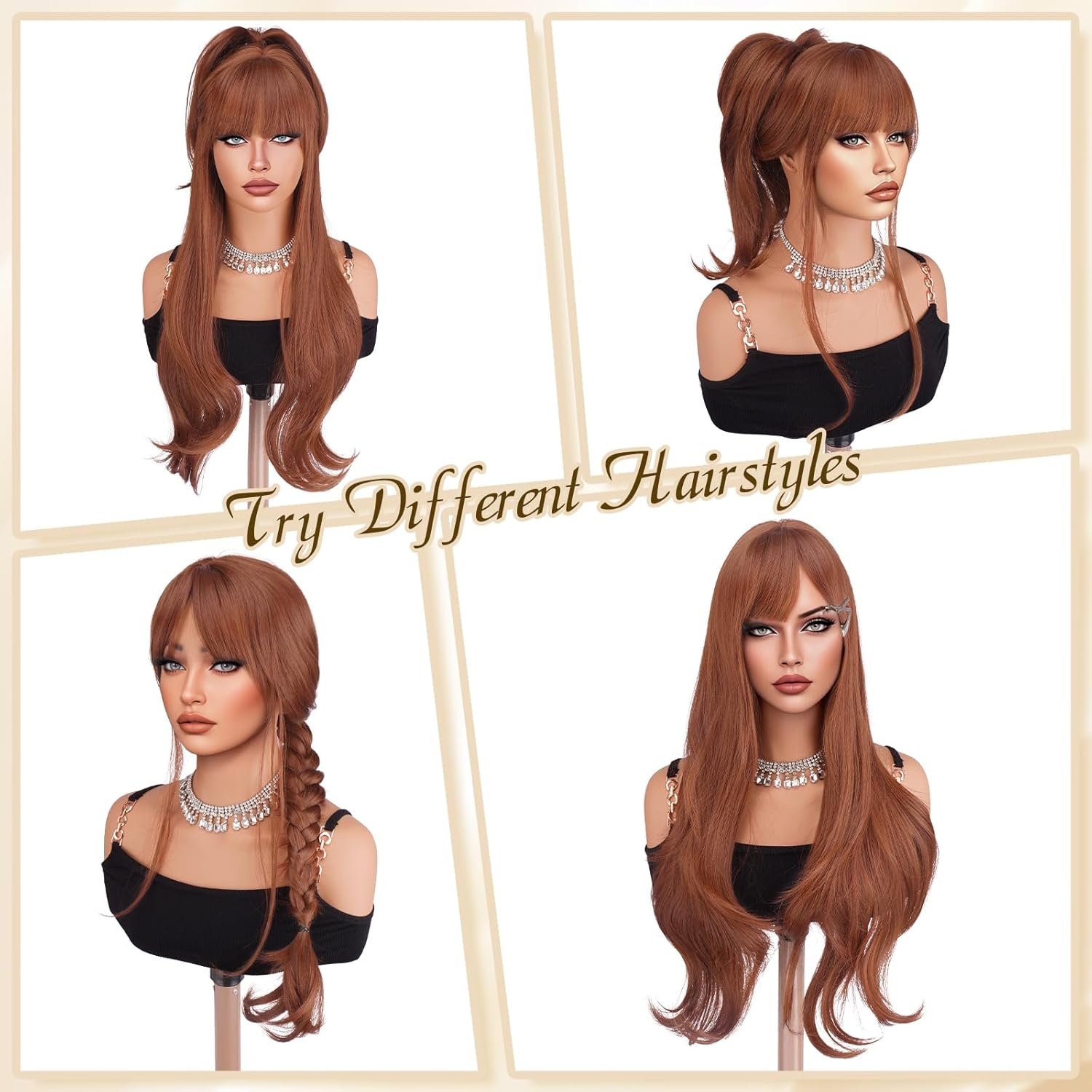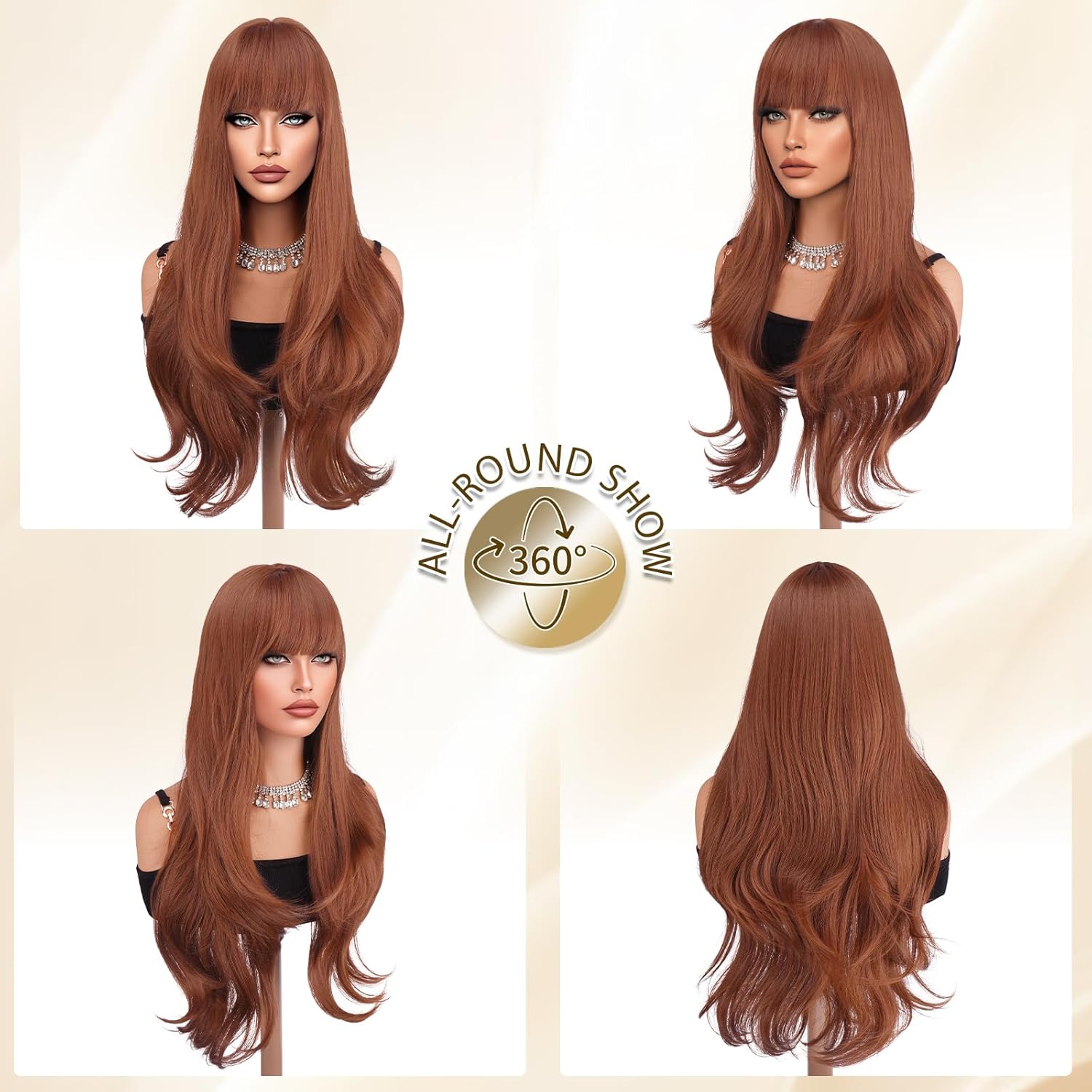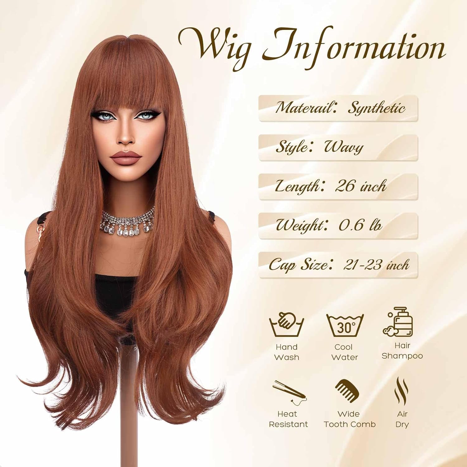Fraud Blocker Haloo Auburn Wigs with Bangs – Long Layered Natural Looking Synthetic Heat Resistant Wavy Hair Wigs for Women Daily Party, 26 Inch | Wigsretail44.com