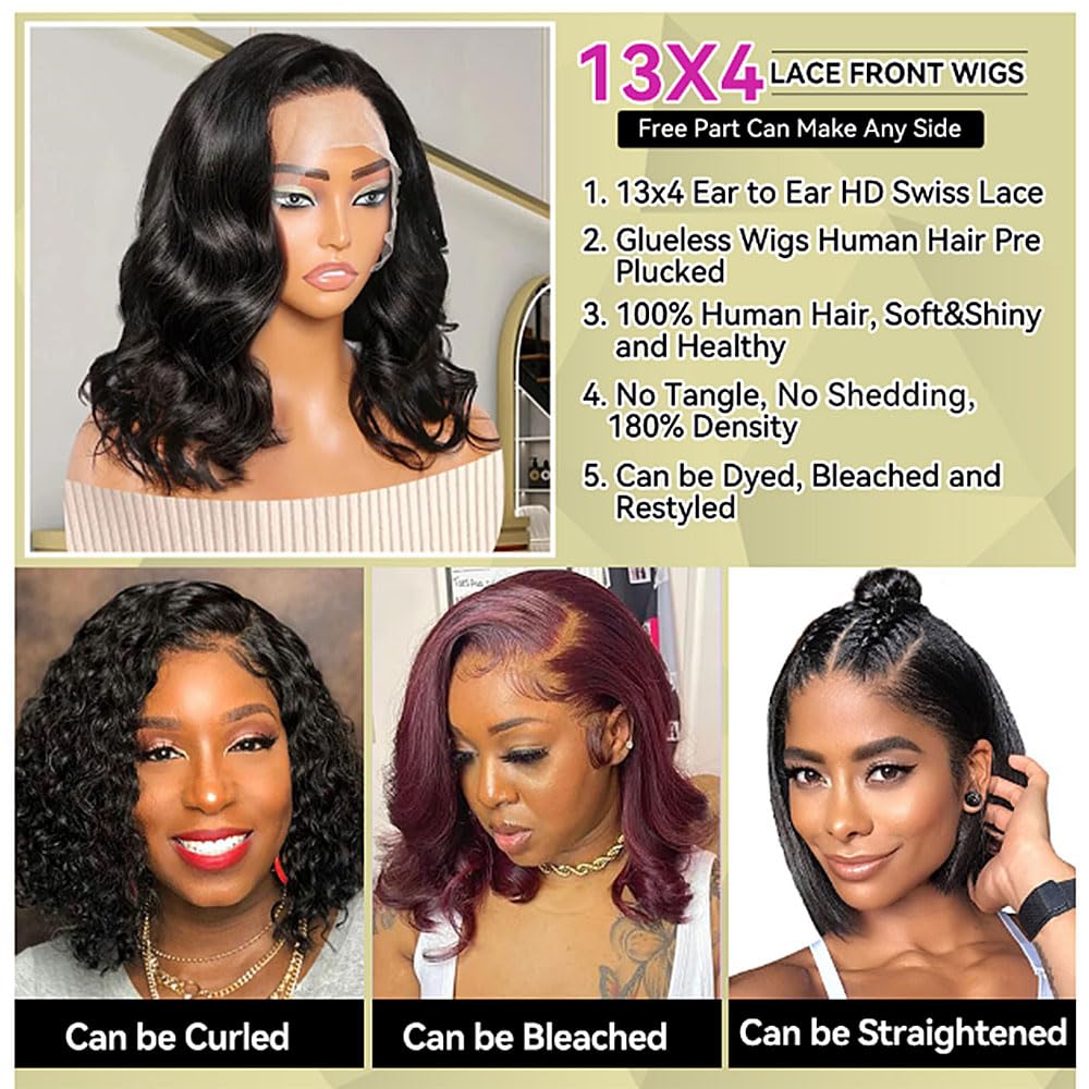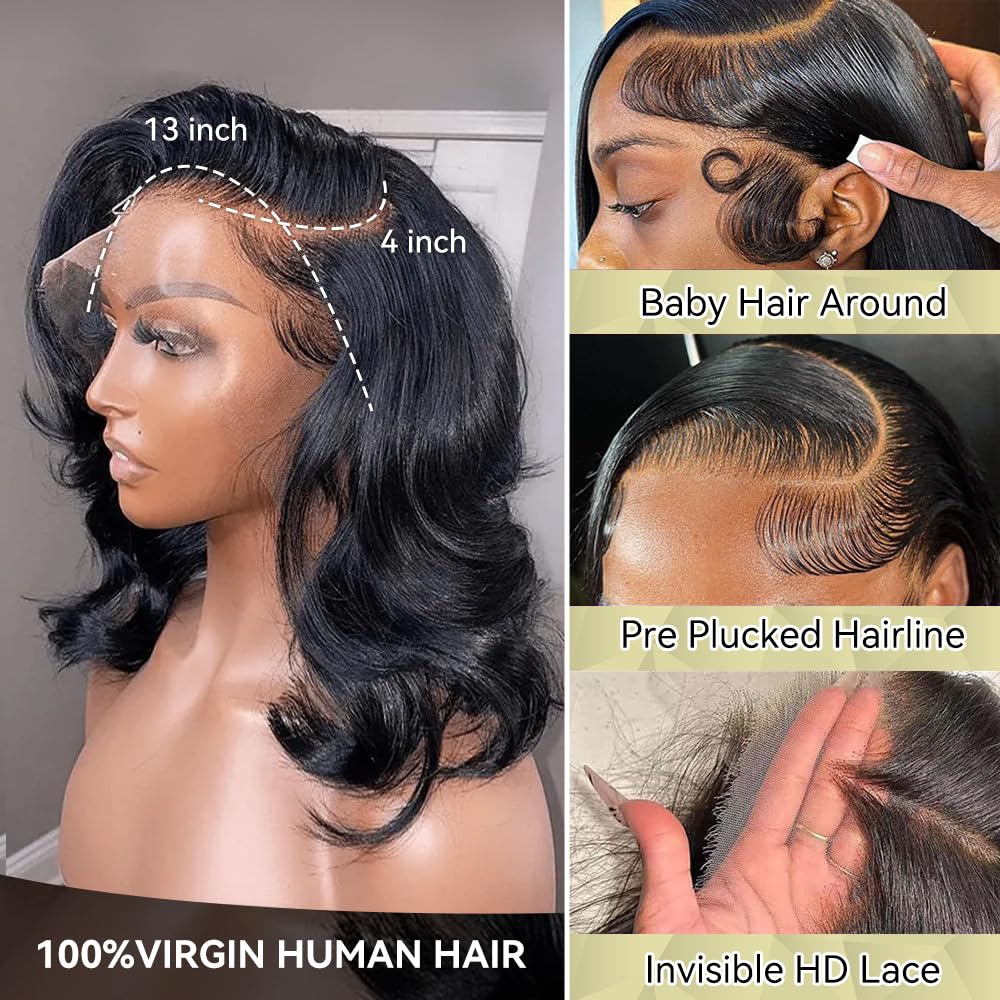 Fraud Blocker HCHHCH 12 Inch Bob Wig Human Hair Glueless 13X4 HD Lace Front Wigs Pre Plucked 180 Density 100% Real Human Hair Short Body Wavy Bob Wigs for Black Women Super Soft and Natural Black Color | Wigsretail44.com