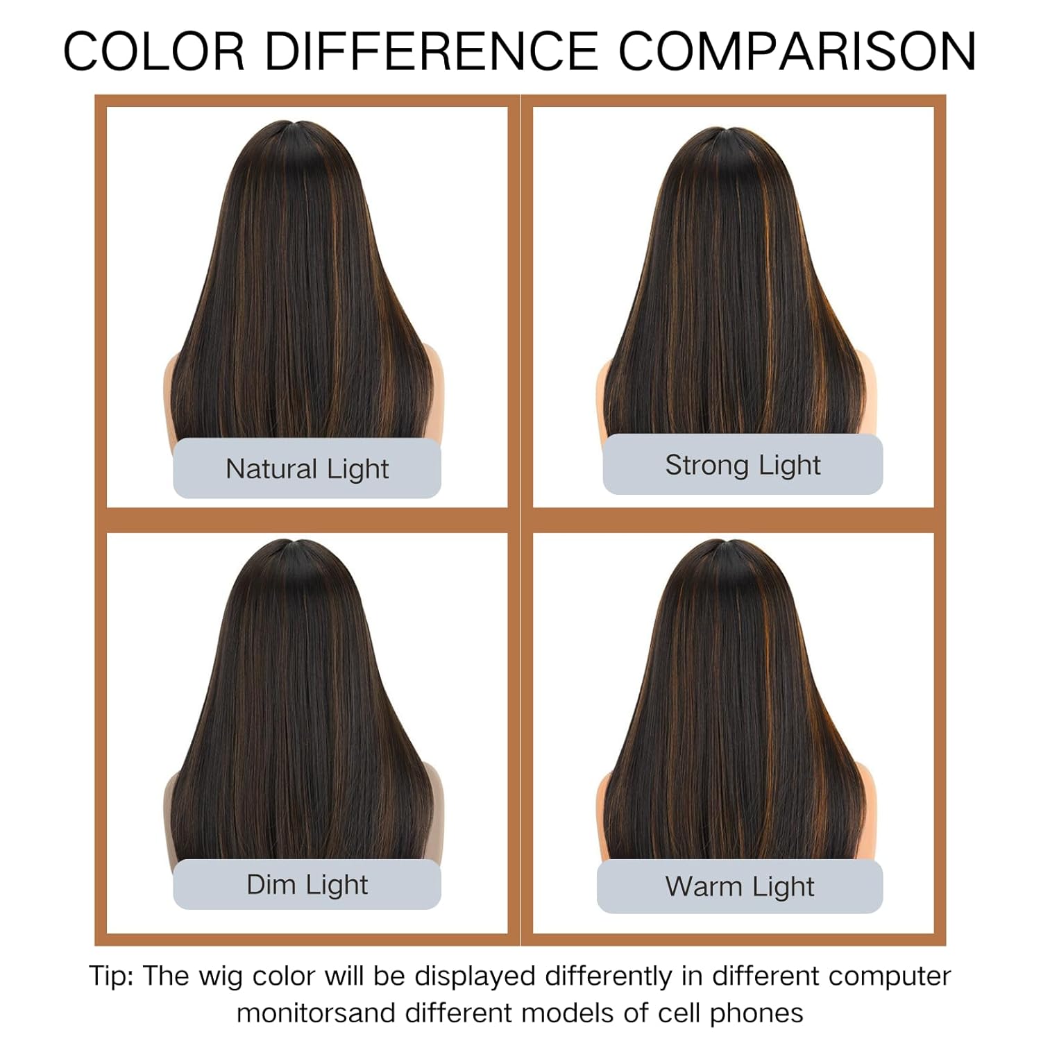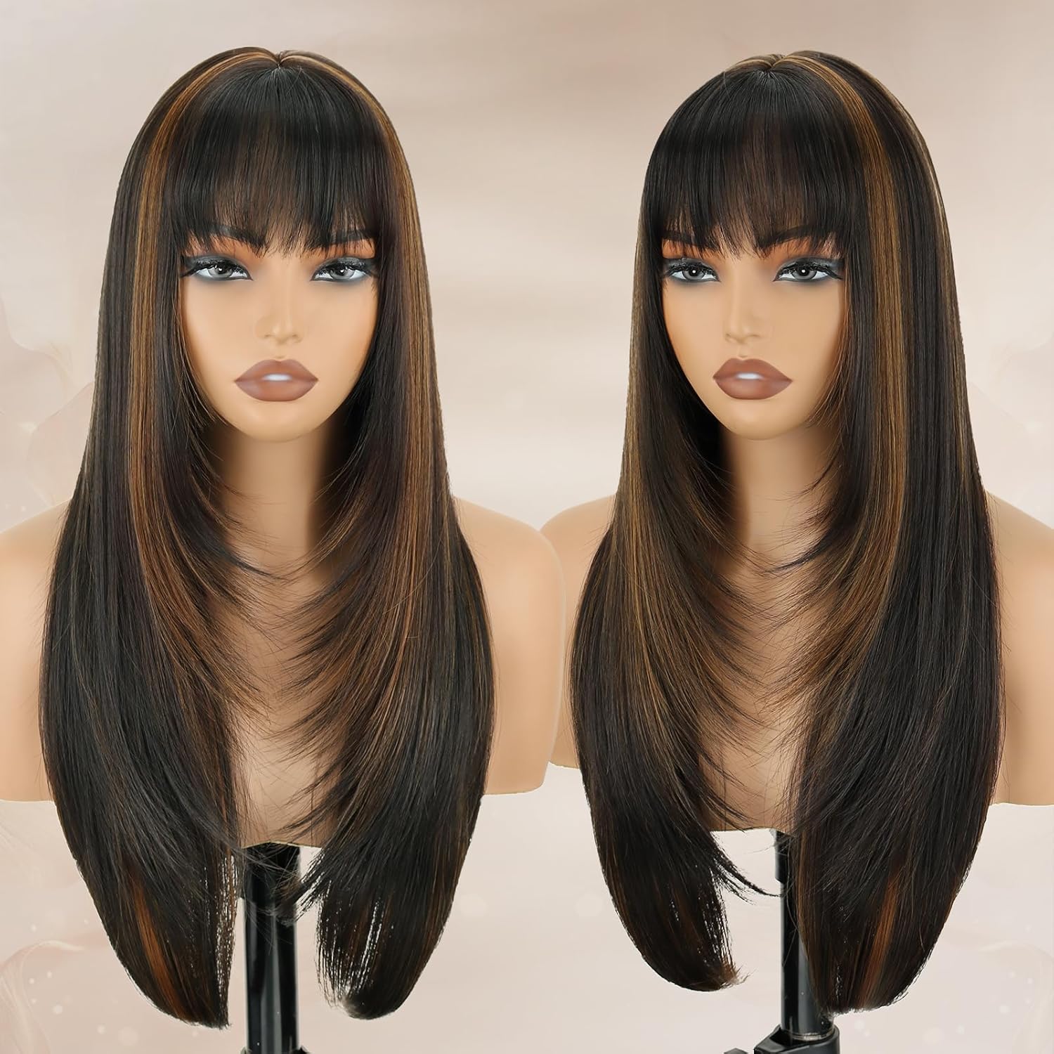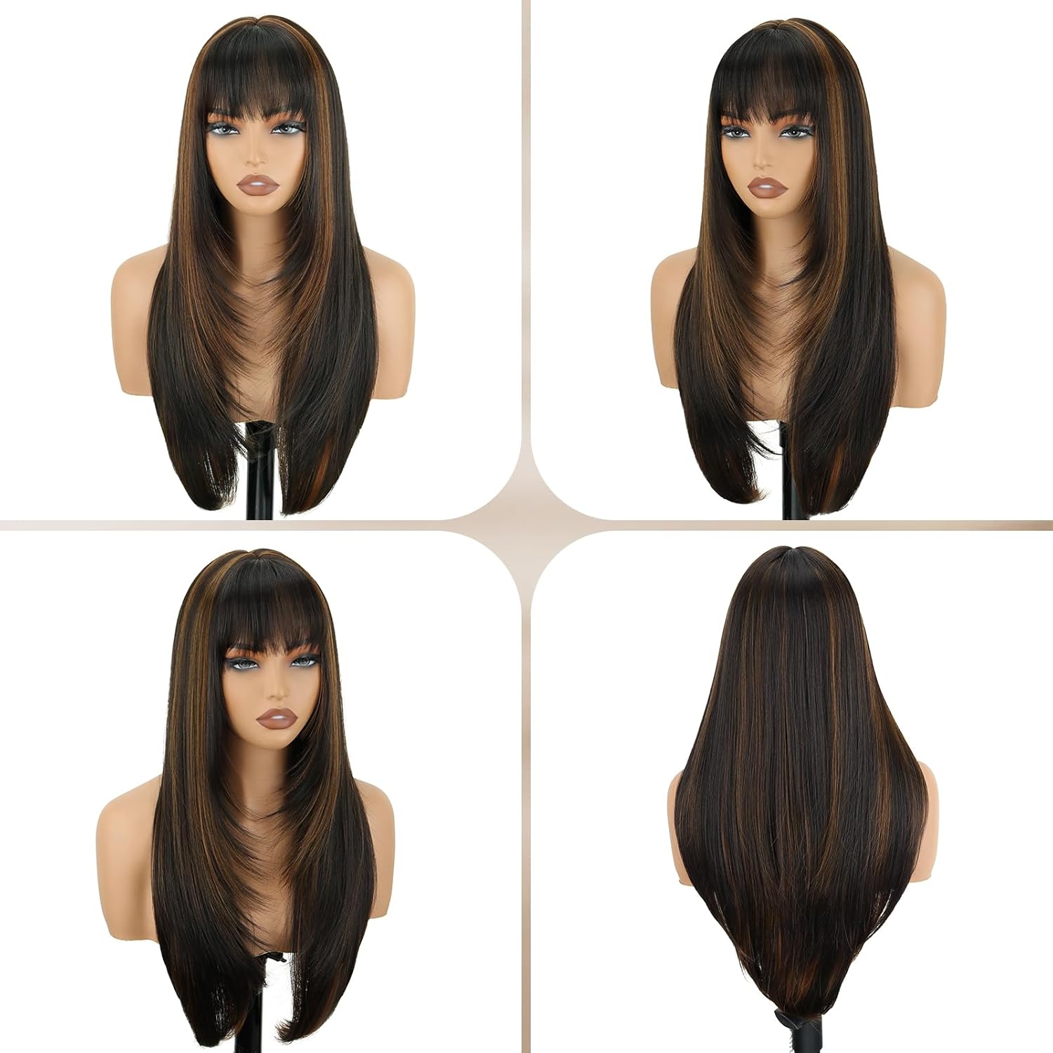 Fraud Blocker Highlight Long Straight Layered Wig with Bangs for Women 26 inch Highlight Brown Put on Go Realistic Synthetic Fiber Heat Resistant Natural Wig for Girls Party Cosplay and Daily Use | Wigsretail44.com