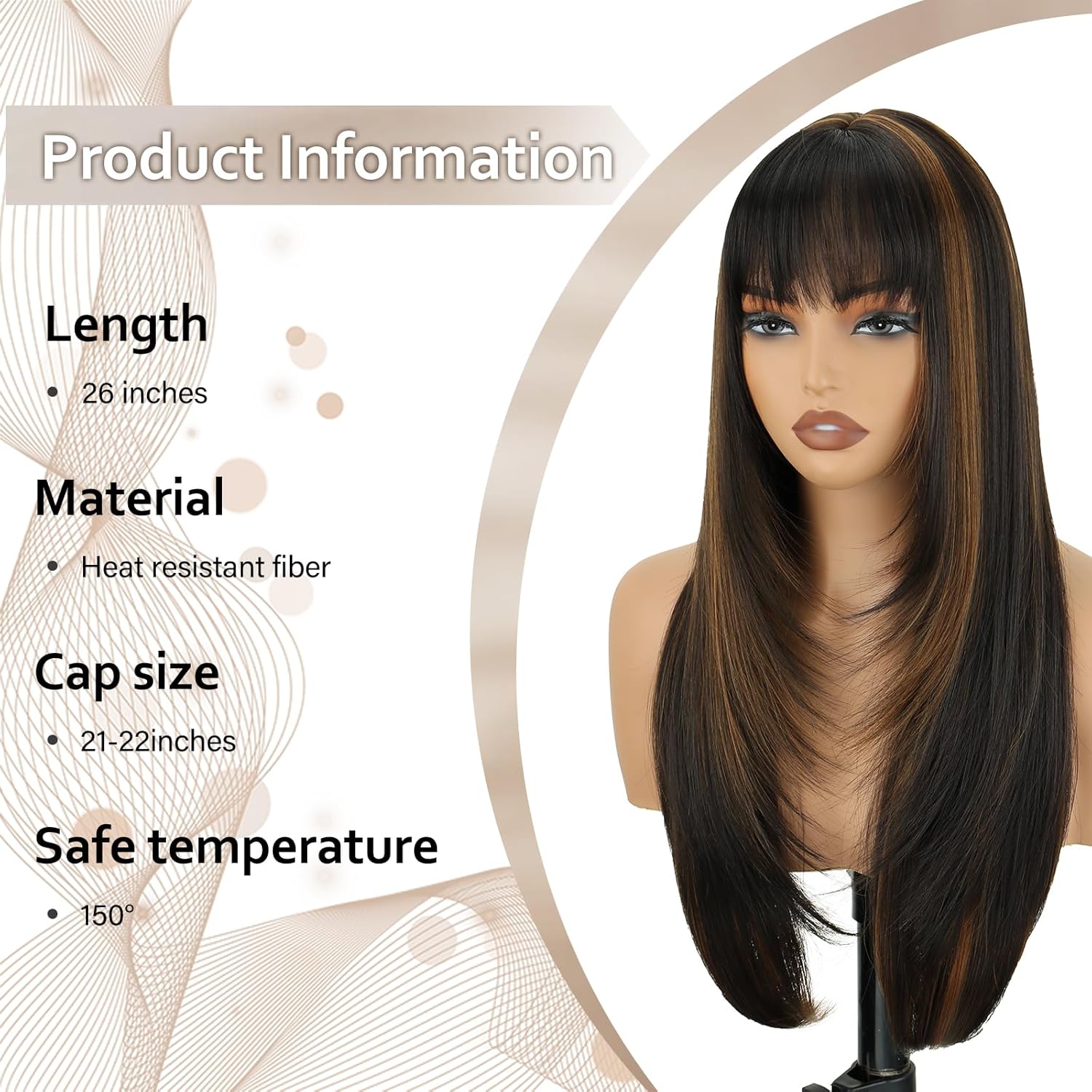 Highlight Long Straight Layered Wig with Bangs for Women 26 inch Highlight Brown Put on Go Realistic Synthetic Fiber Heat Resistant Natural Wig for Girls Party Cosplay and Daily Use