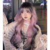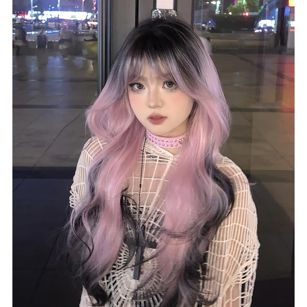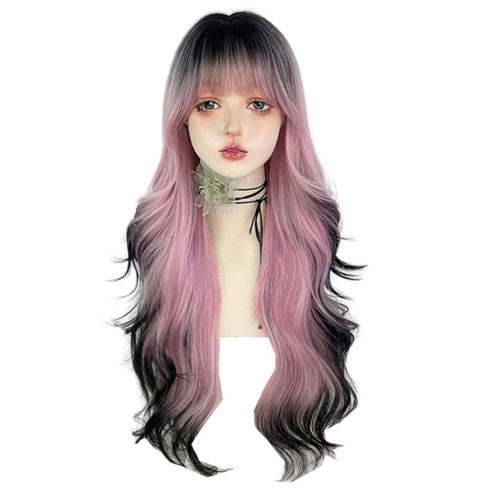 Fraud Blocker Long Wavy Black Pink Gradient Wigs for Women with Bangs Realistic Natural Looking Hair Replacement Wigs Synthetic Long Curly Hair Wig for Daily Party Use | Wigsretail44.com