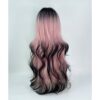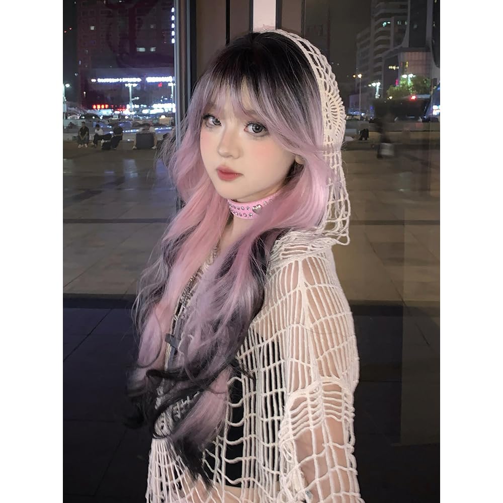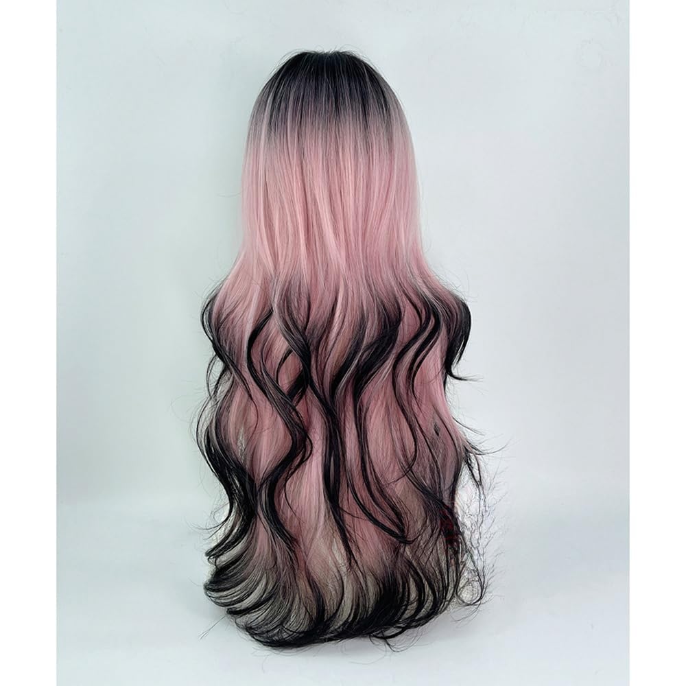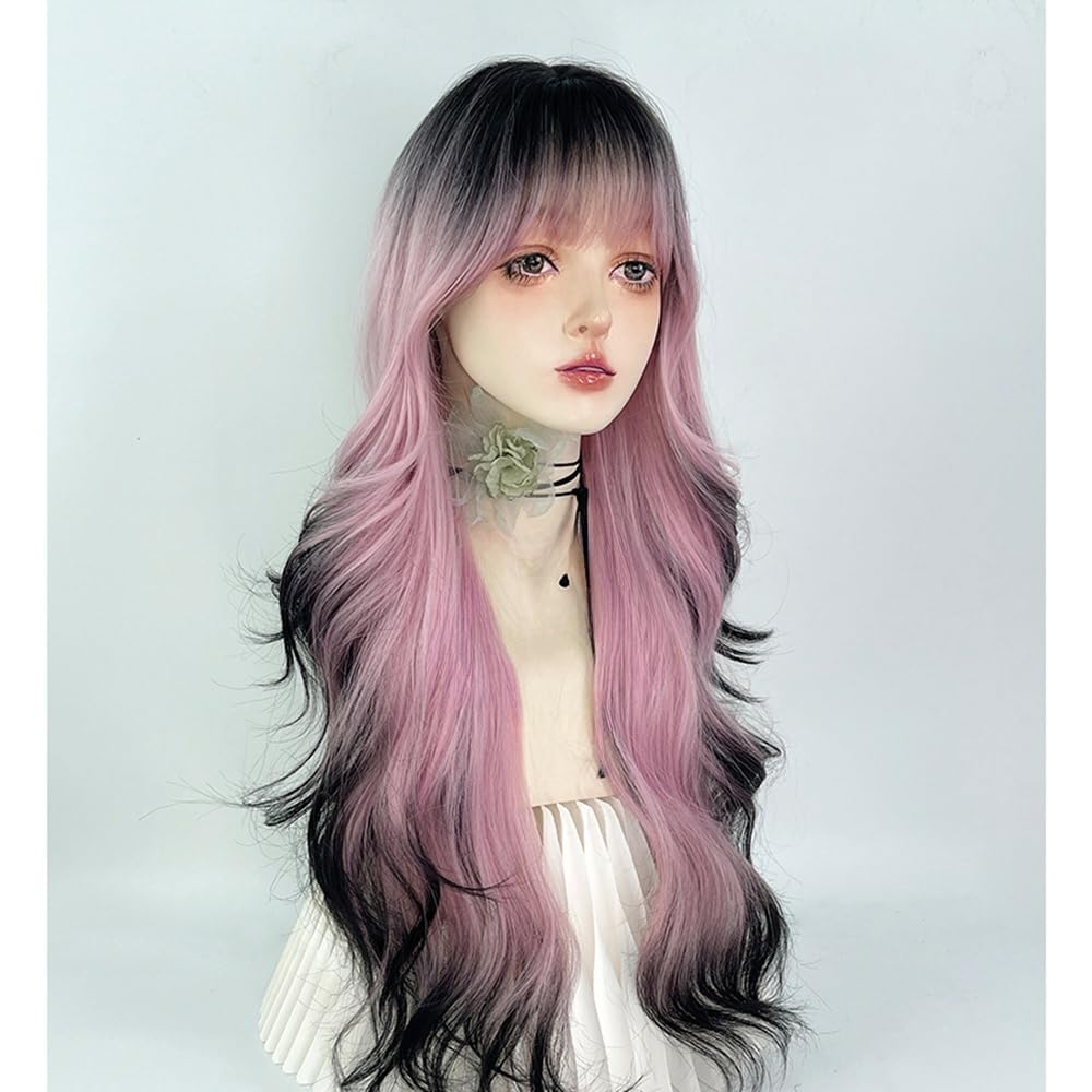 Long Wavy Black Pink Gradient Wigs for Women with Bangs Realistic Natural Looking Hair Replacement Wigs Synthetic Long Curly Hair Wig for Daily Party Use