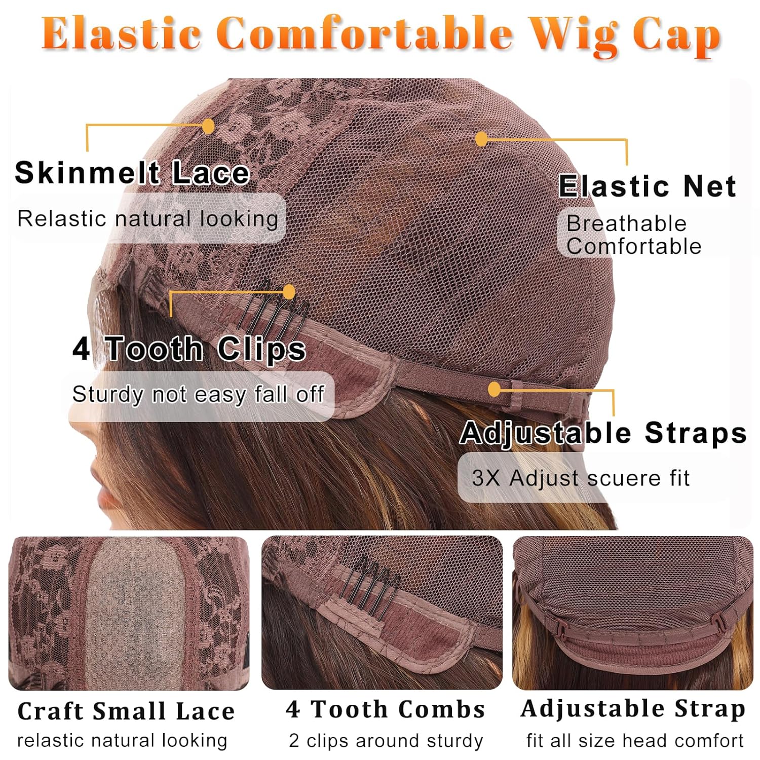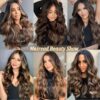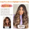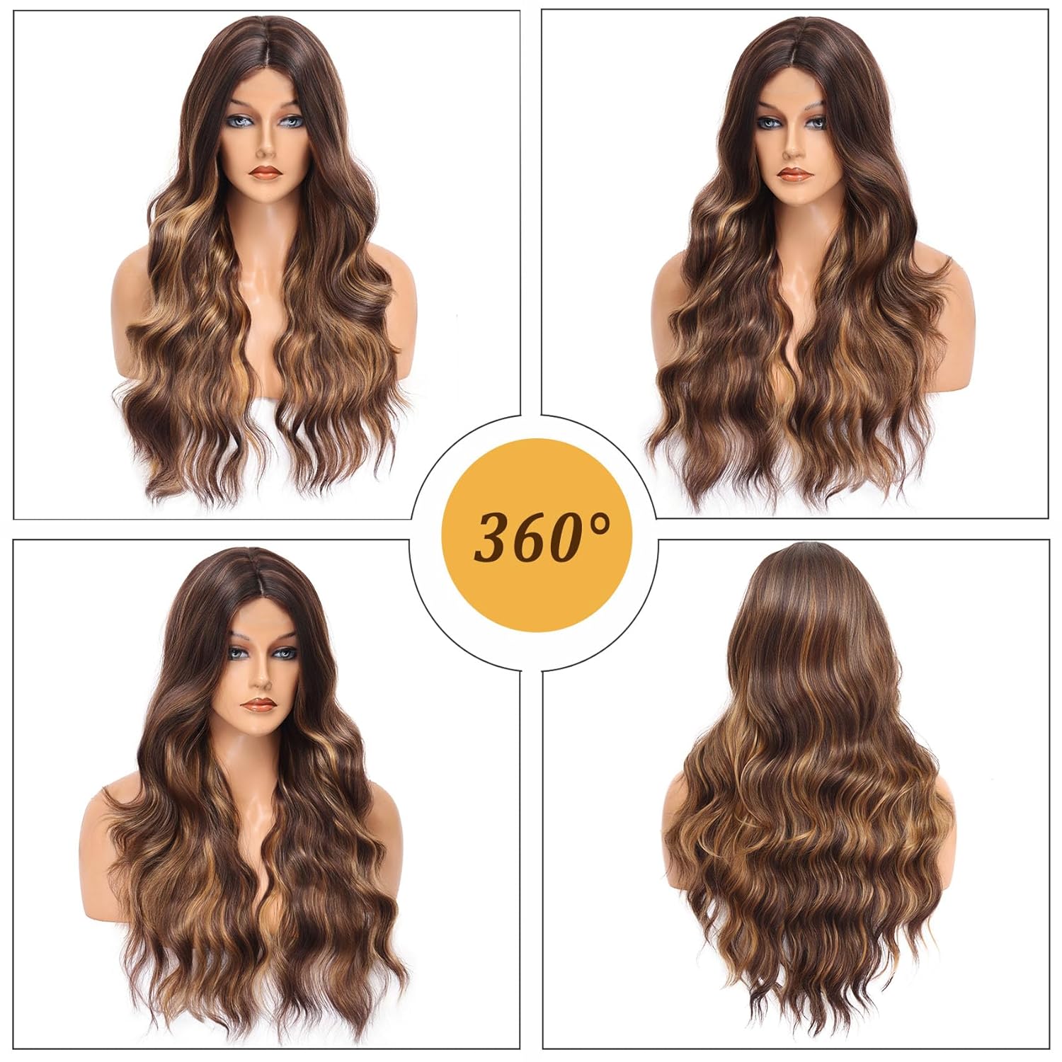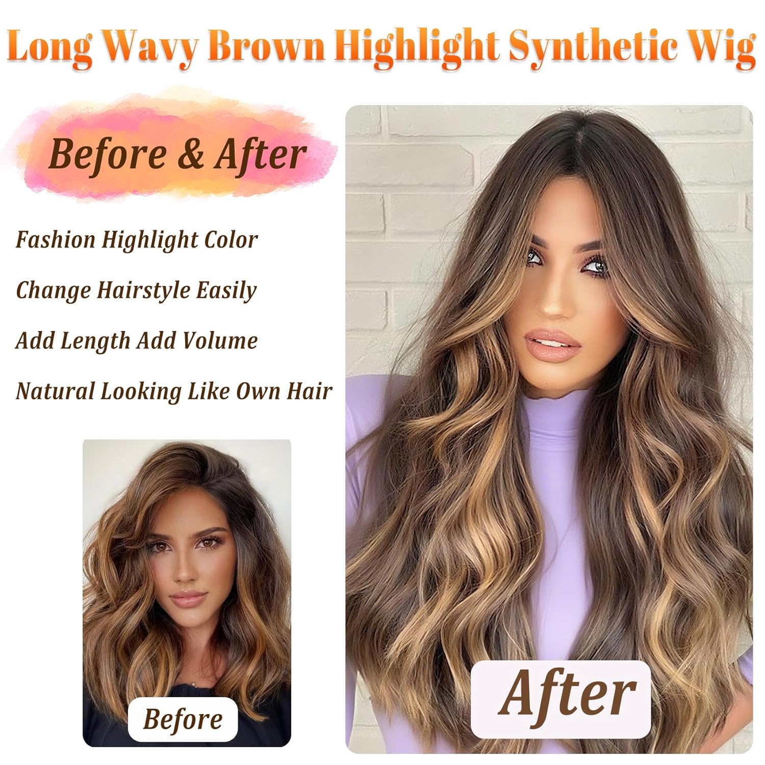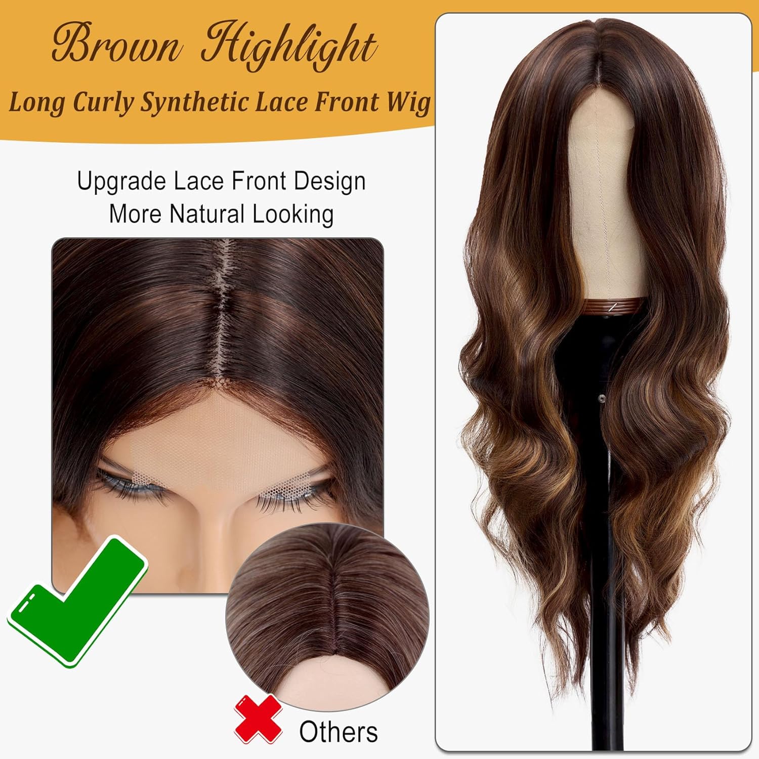 Mairead Long Brown Highlight Wavy Wig Curly Synthetic Lace Front Wigs for Black Women Long Middle Part Glueless Wig 26 Inch Body Wave Wig Natural Looking for Daily Party Use