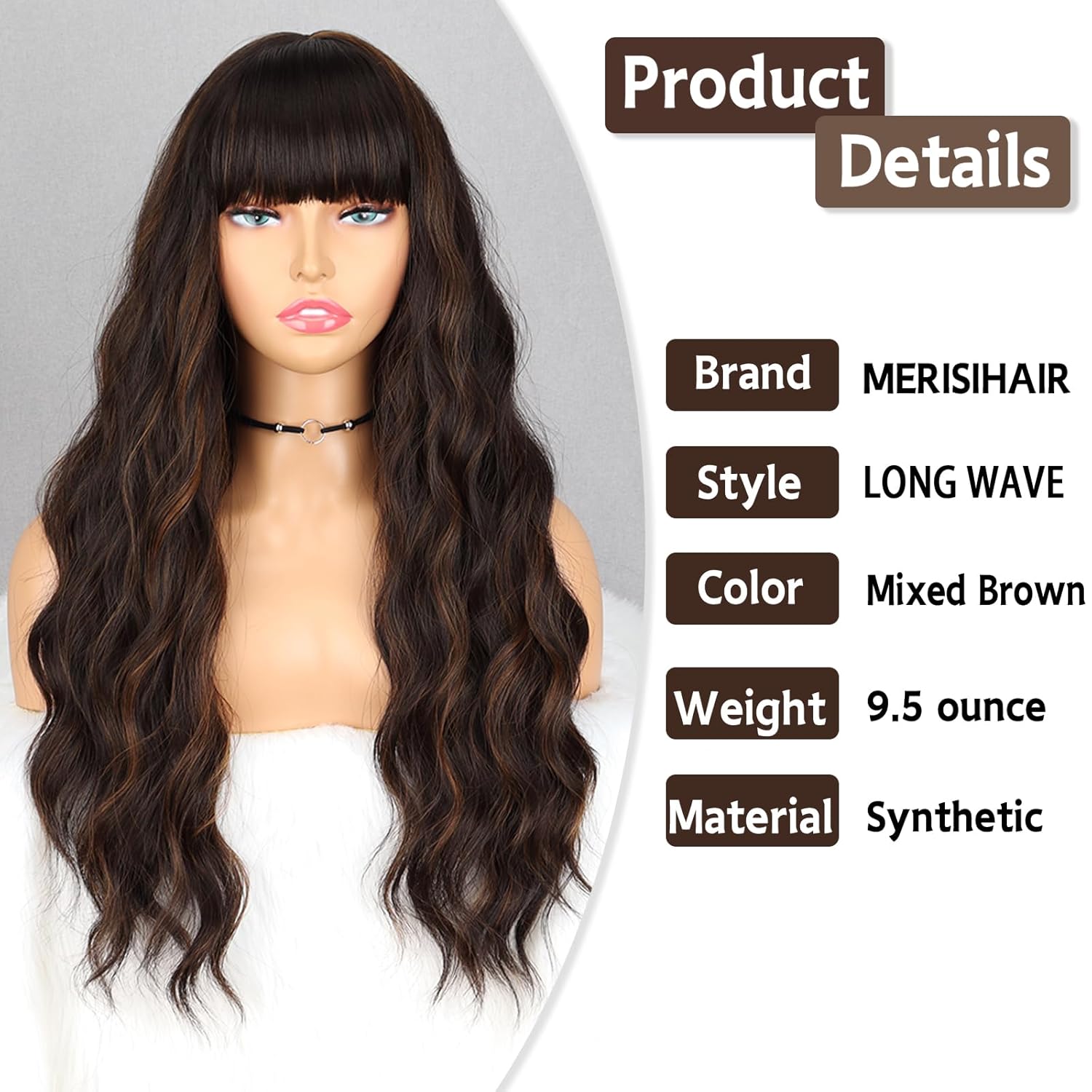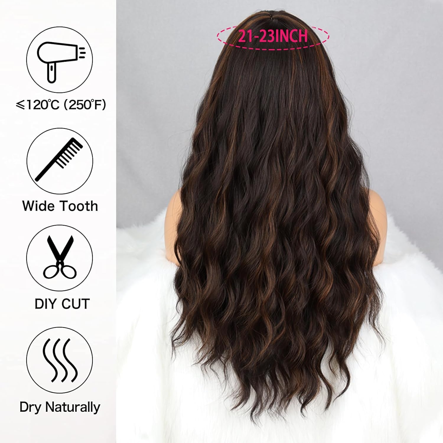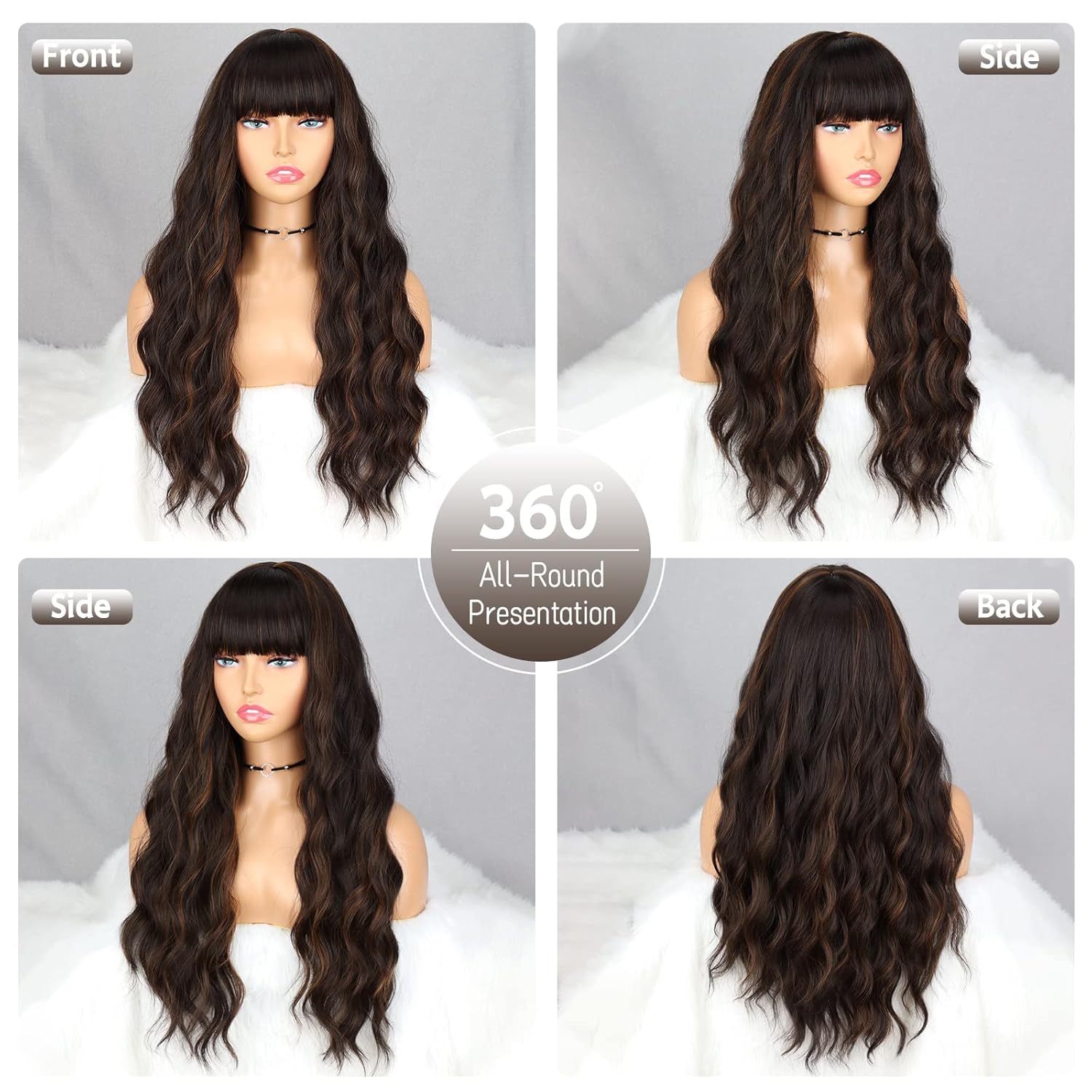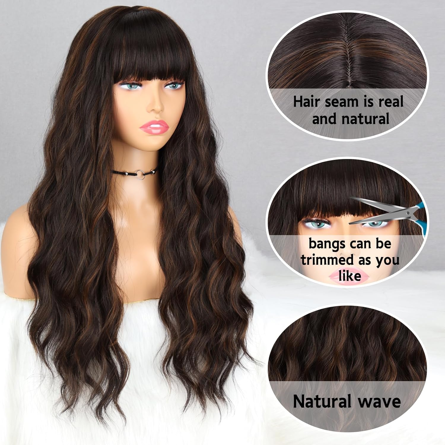 Experience Luxurious Locks with the Synthetic Wig: Long Wavy Brown Highlight Wig with Bangs