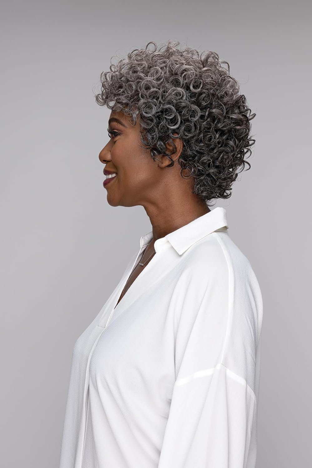 Ms.Granny Posy Wig, Hair type 3b curl, Medium boycut style (URBAN GRAY)