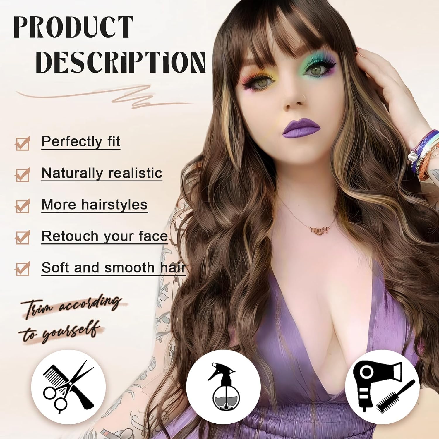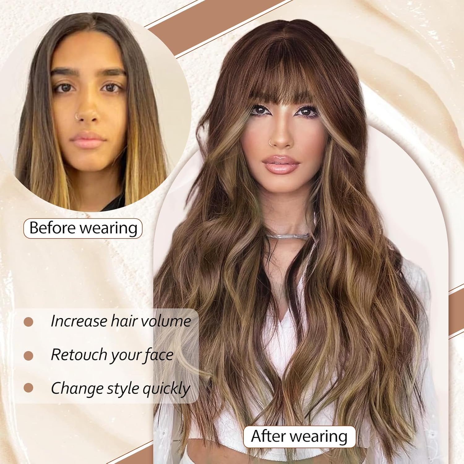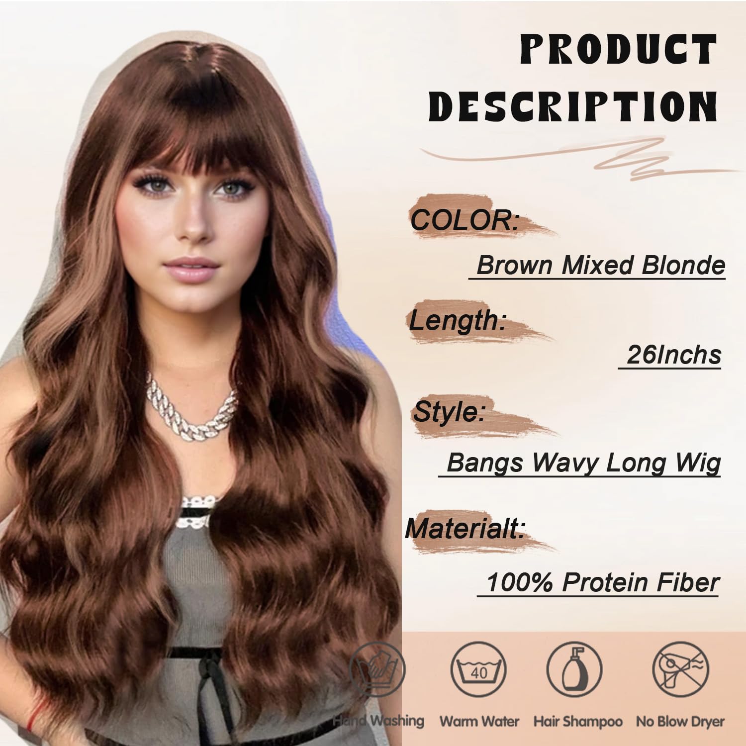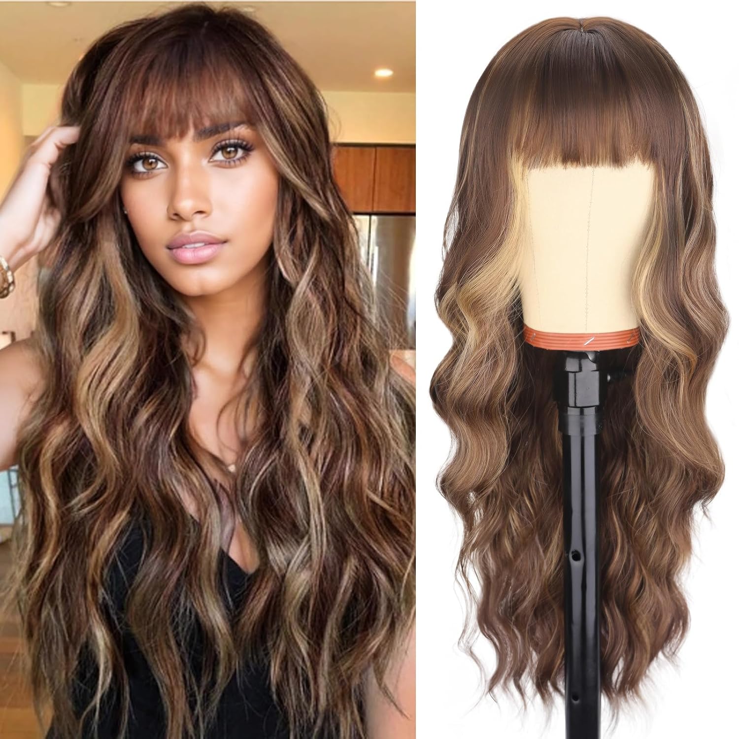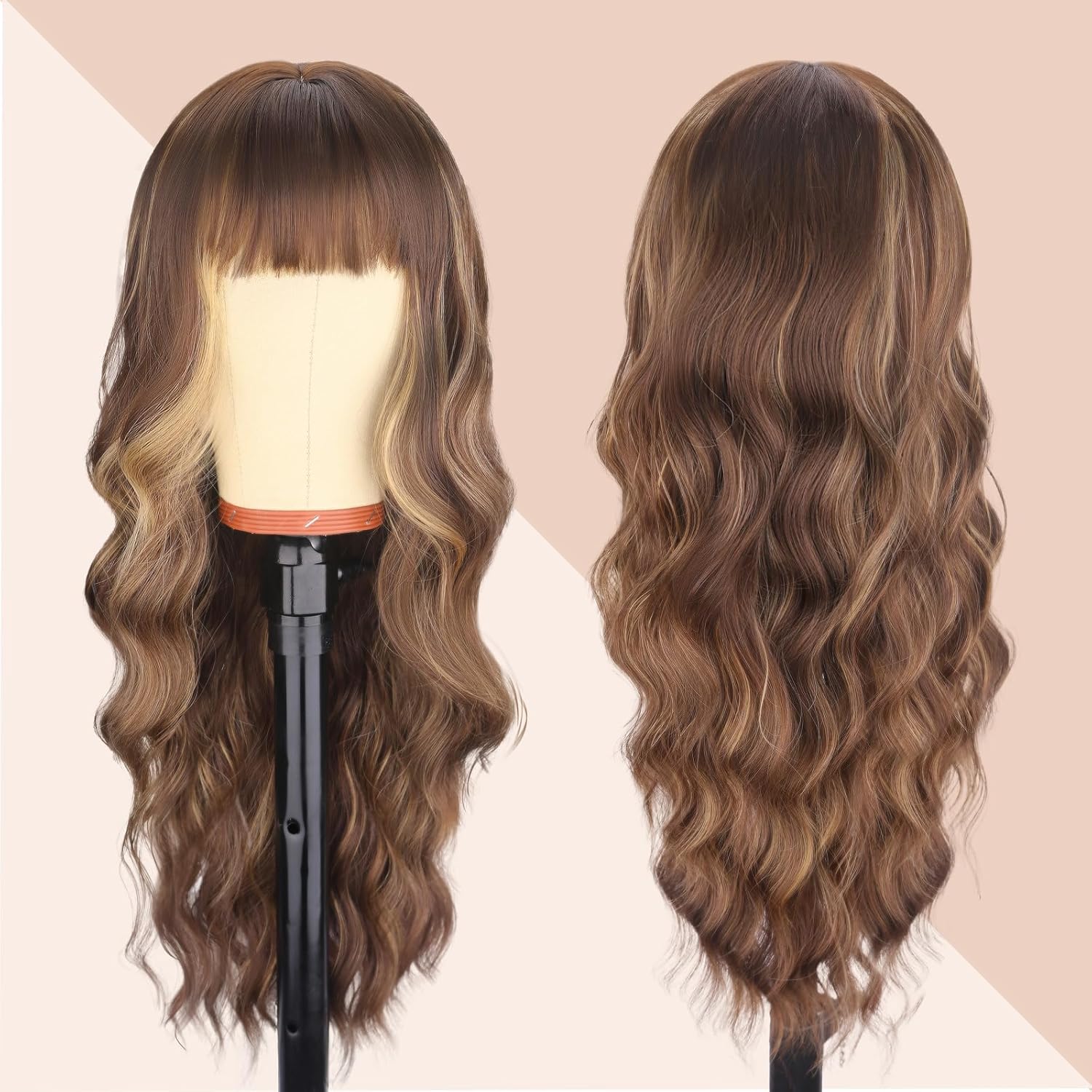 – Brown mix blonde highlight long wavy wig