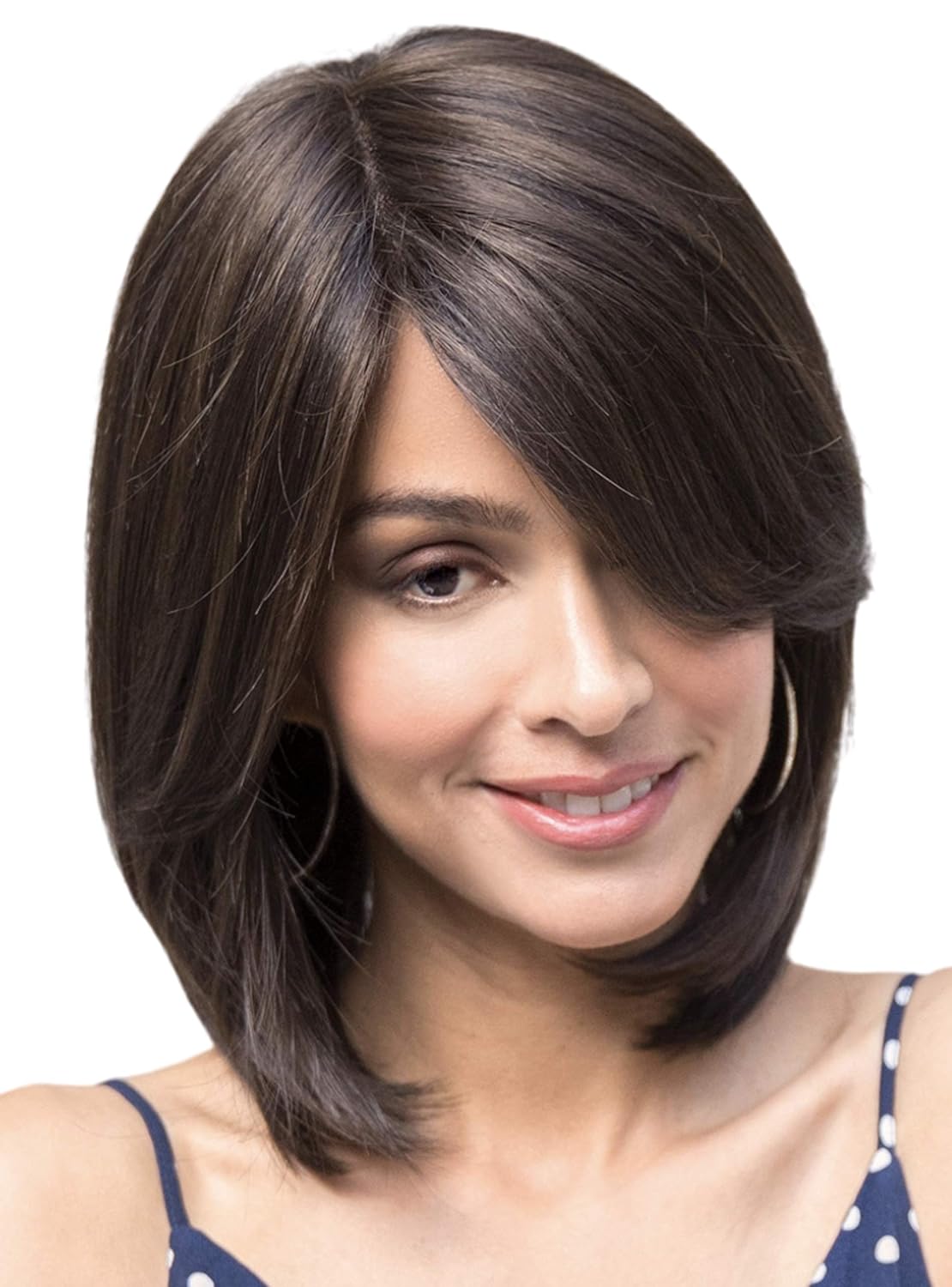 - Includes a synthetic, shoulder-length wig with a soft pageboy cut, chiseled ends, and side swept-textured fringe.