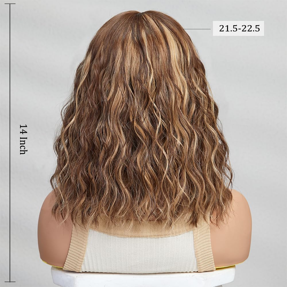 Short Brown Blonde Wig,Shoulder Length Bob Curly Wavy Ombre Brown Wig With Bangs for Women, Charming Heat-resistant Synthetic Hair Wigs for Date Daily Use