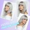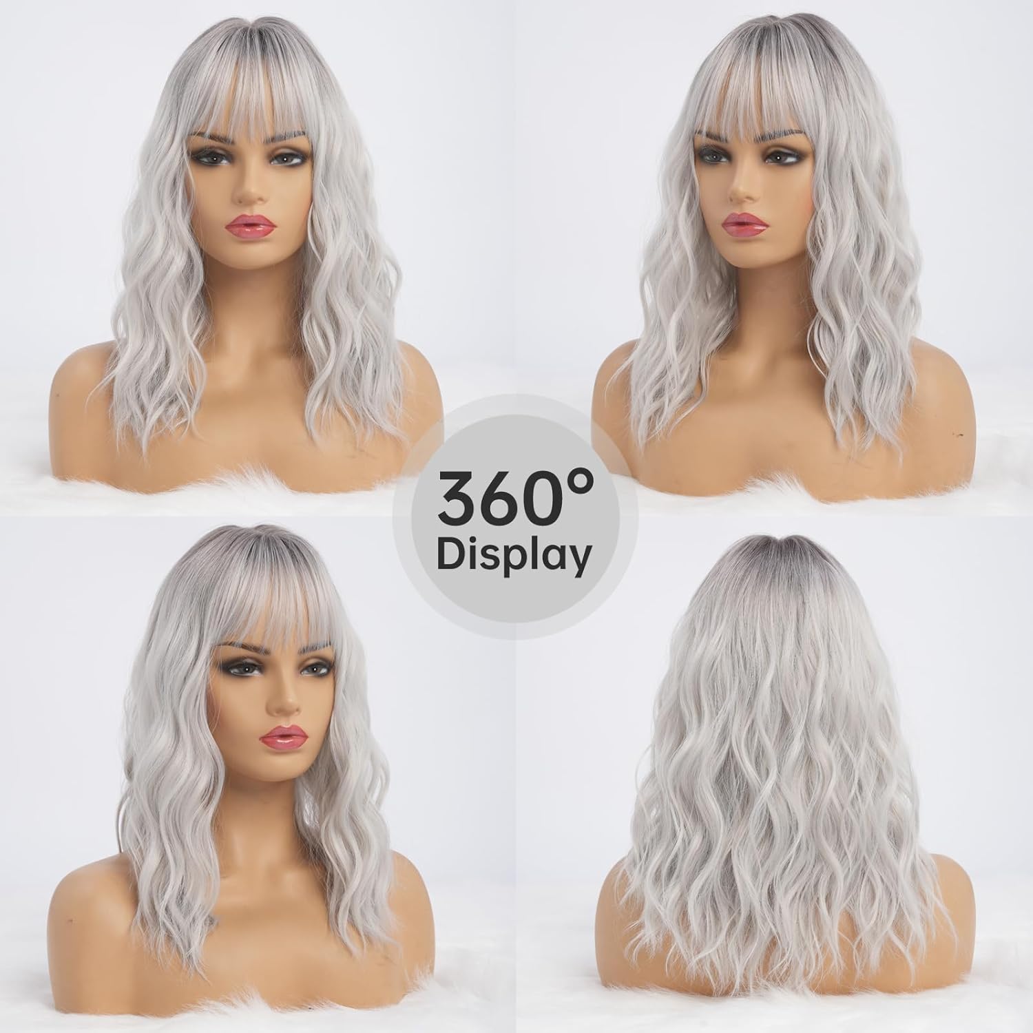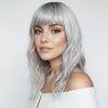 – Medium-length 16-inch natural Ombre Silver wig with bangs