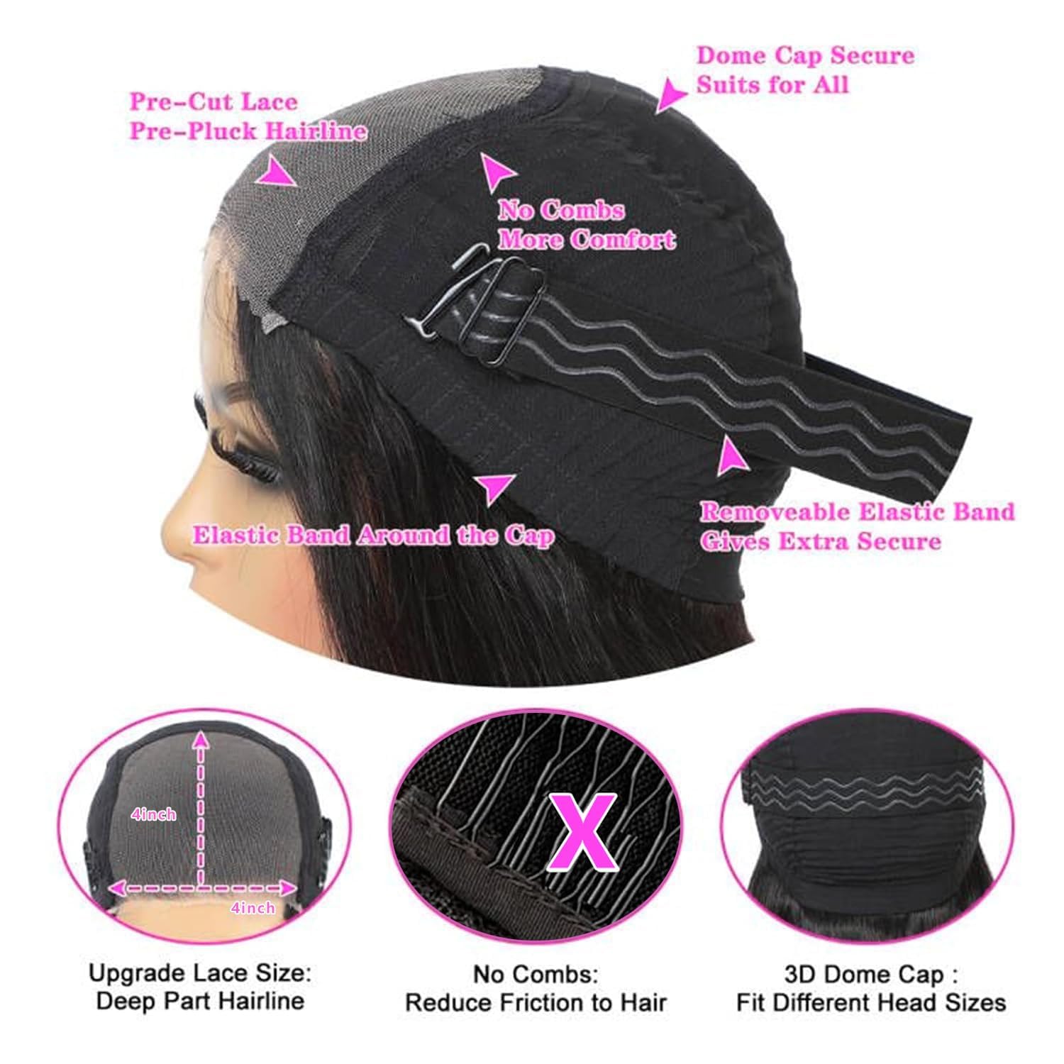 – Lace: 4×4 closure with pre-plucked HD lace