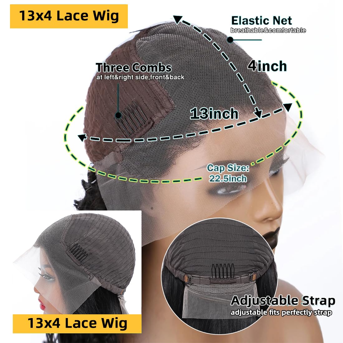 – Wig Cap: Medium cap size (22-22.5 inches) with 3 combs and adjustable straps