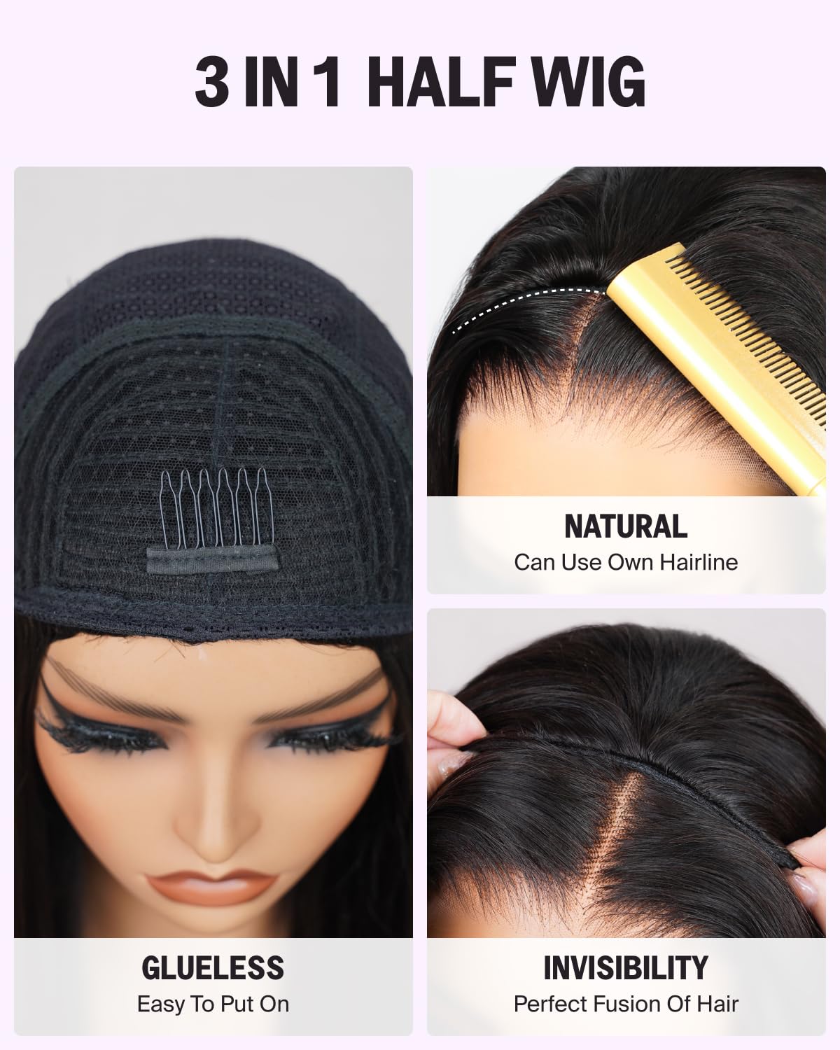 – Glueless design for easy wear